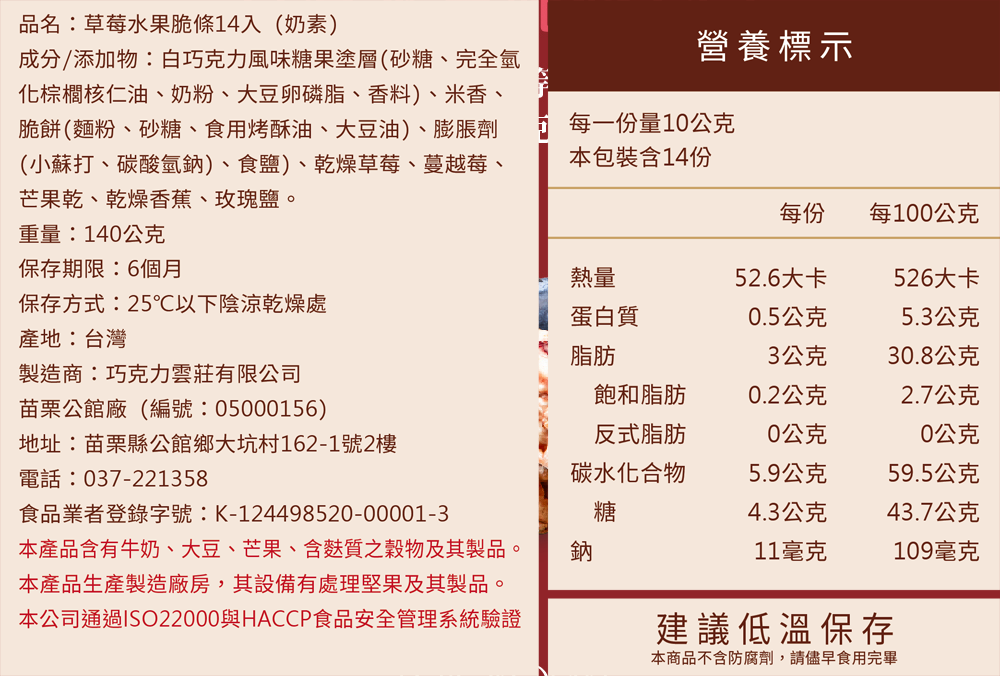◆商品介紹精選草莓、蔓越莓、芒果、香蕉等多種水果乾與米香、脆餅充分融合,再淋上草莓白巧克力酥脆的多層次口感,香甜濃郁的迷人好滋味