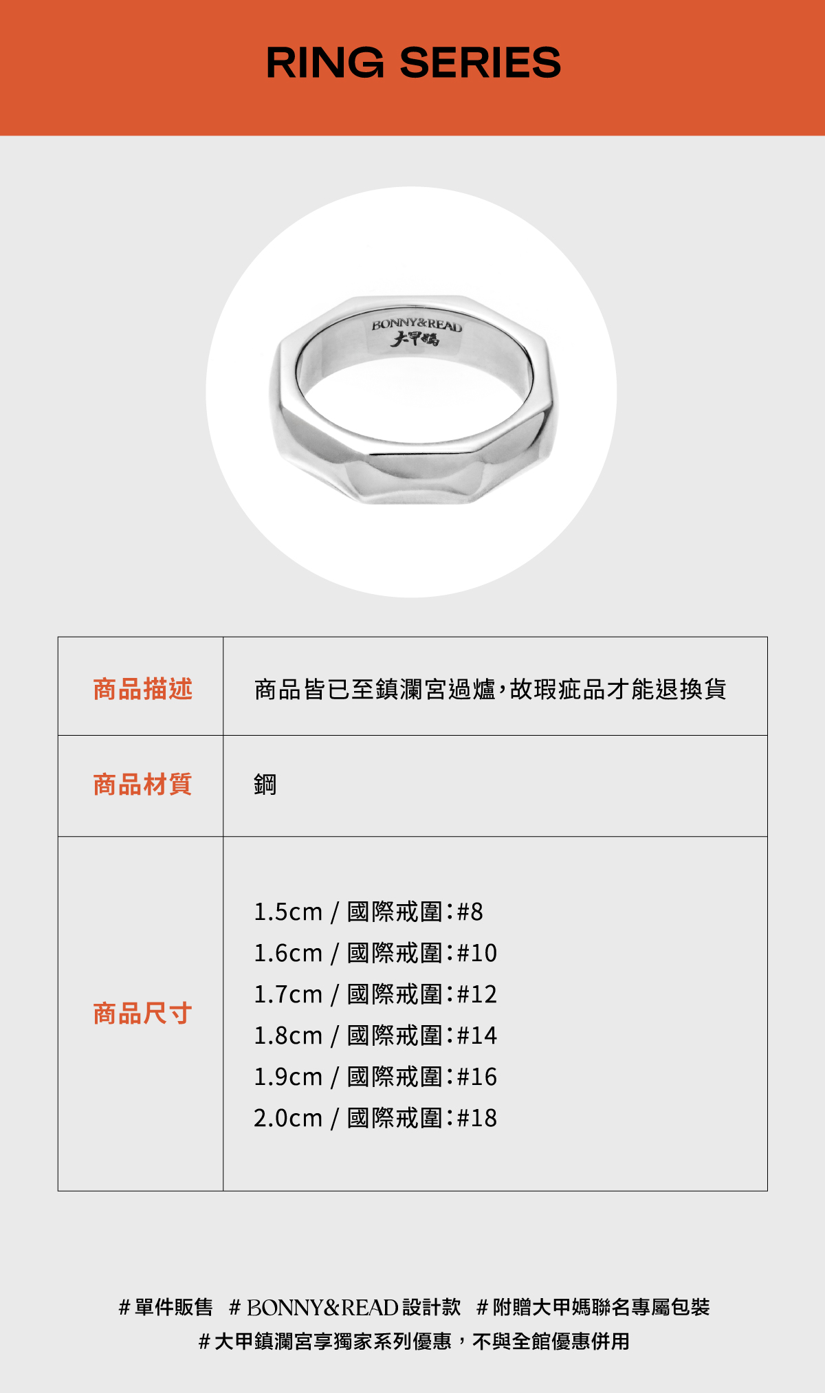 ● 戒指內圍尺寸:內圍直徑 1.5cm (#8) / 1.6cm (#10) / 1.7cm (#12) / 1.8cm (#14) / 1.9cm (#16) / 2.0cm (#18)