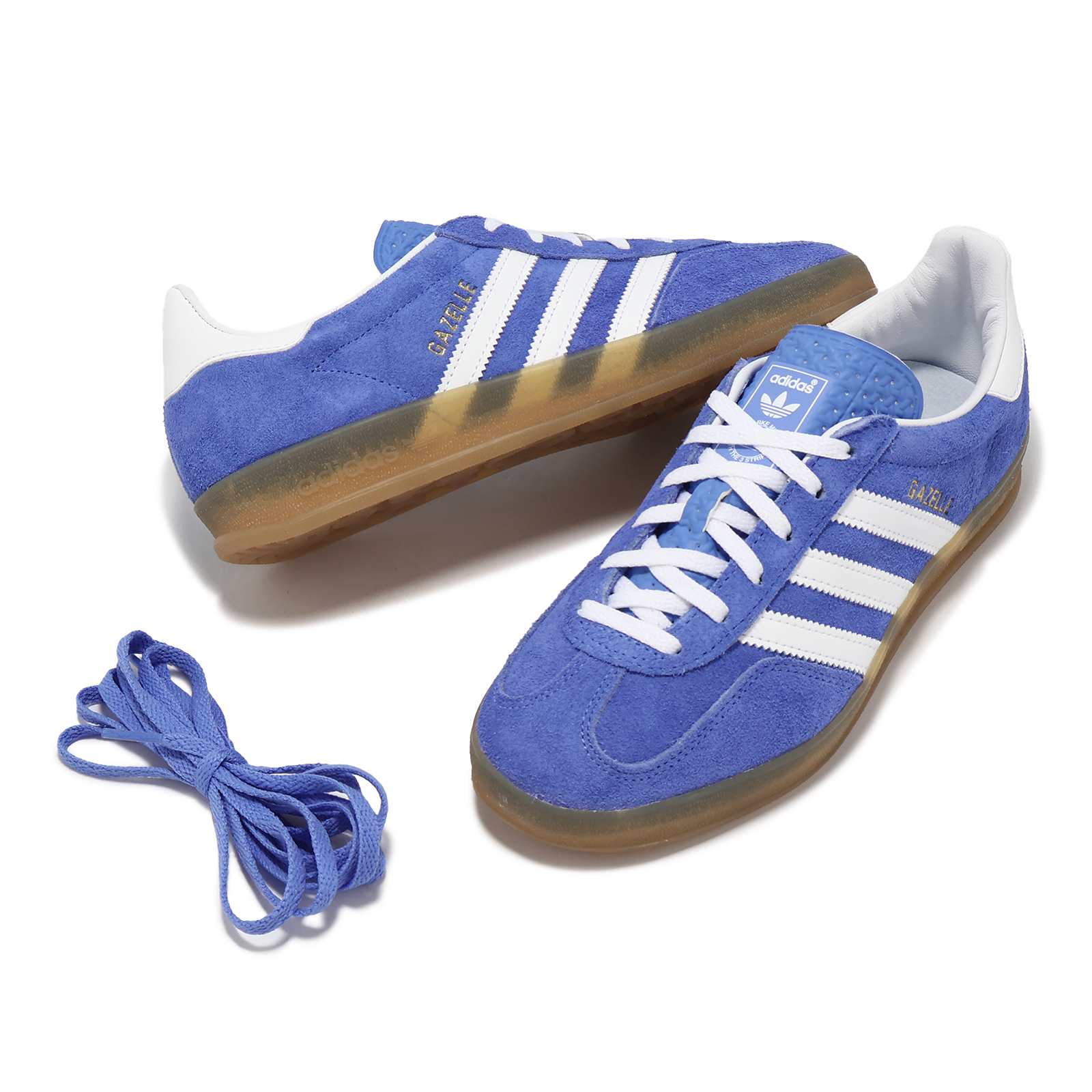 * 低調的造型和三條紋設計,完美的保留經典復古的視覺效果,藍色麂皮壓紋鞋面搭配 Gazelle 字樣。