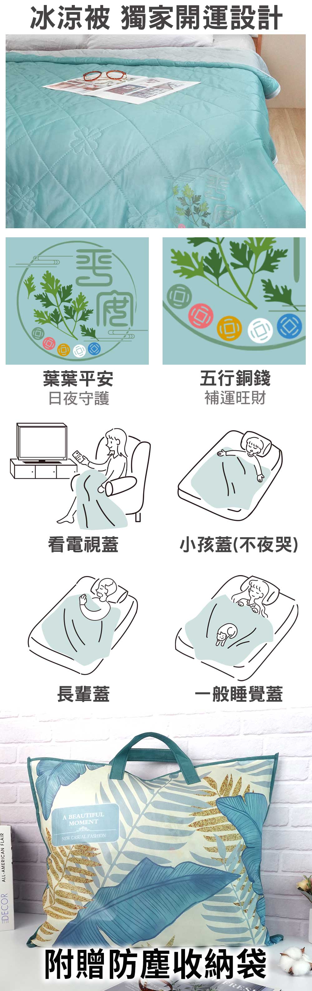 艾草涼被新添加涼感纖維,全面提升被體涼感度,再搭配獨家開運設計:葉葉平安-日夜使用都好眠、五行銅錢-補運再招財,特別適用於體弱的長輩、睡眠不佳者或容易受驚的小孩,在涼感呵護的同時有安神定魄之效,輕鬆改善睡眠品質得到個人元神光彩!除了睡眠使用也適合一般休憩時披蓋使用;另有附贈防塵收納袋,不但收納便利同時也十分美觀,亦可當作贈送親友的伴手禮。