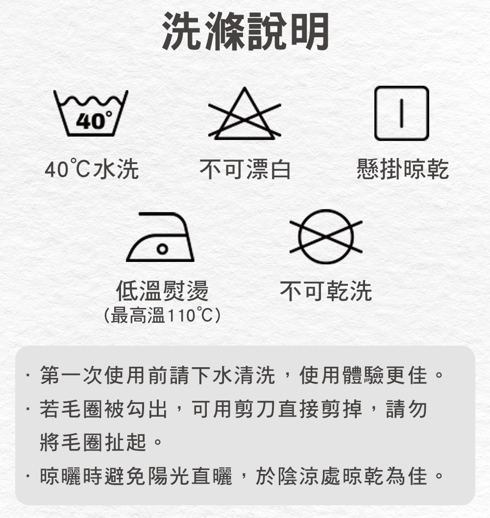 3. 建議手洗或者使用洗衣袋以預防織毛拉扯傷害。
