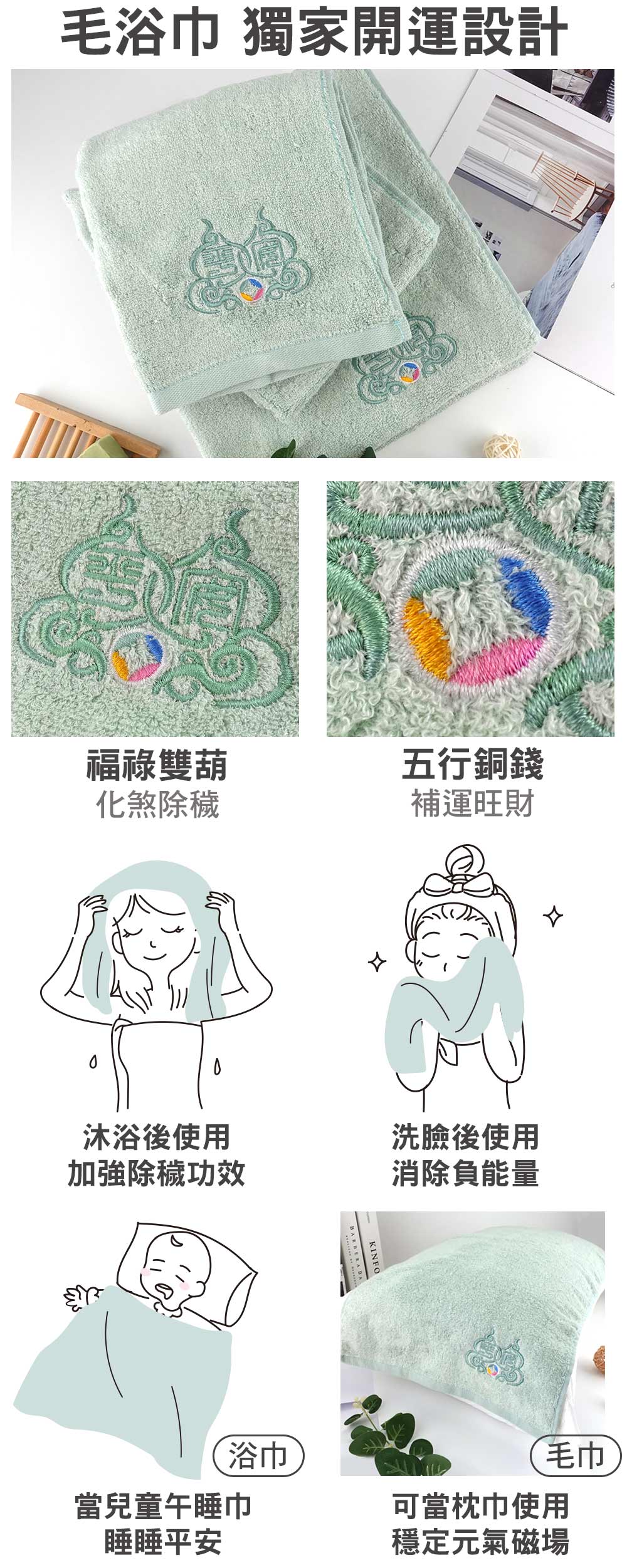 兩款艾草巾上皆繡有獨家開運圖騰:(1)福祿葫蘆-具備除穢化煞的能量,可化解負能量,再注入正向的財運氣場。(2)五行銅錢-葫蘆中暗藏「平安」吉祥字與五色繡線銅錢,運用五行色「木、火、土、金、水」相生相旺的開運法則縫製,補足本命五行所缺之能量,讓你元辰光彩、五路進財。當外出去到磁場較混亂的環境後,回家洗澡後務必使用艾草巾擦拭,可以加強除穢功效。【浴巾】除了沐浴後擦拭身體也可以當兒童午睡被使用,減少惡夢、安穩入睡、消除磁場的負能量。【長毛巾】除了當洗臉巾之外也可當枕巾使用,有助穩定元氣磁場,收驚安眠養護元神!