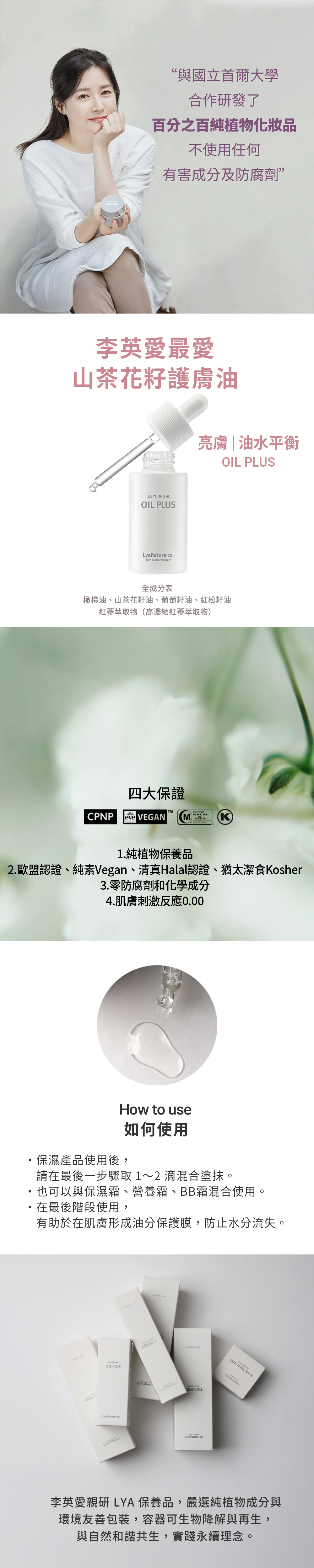 成份:橄欖果油(Olea Europaea (Olive) Fruit Oil)、山籽油茶(Camellia Japonica Seed Oil)、葡萄籽油(Vitis Vinifera (Grape) Seed Oil)、人蔘根提取物(Panax Ginseng Root Extract)、紅松籽油(Pinus Koraiensis Seed Oil)