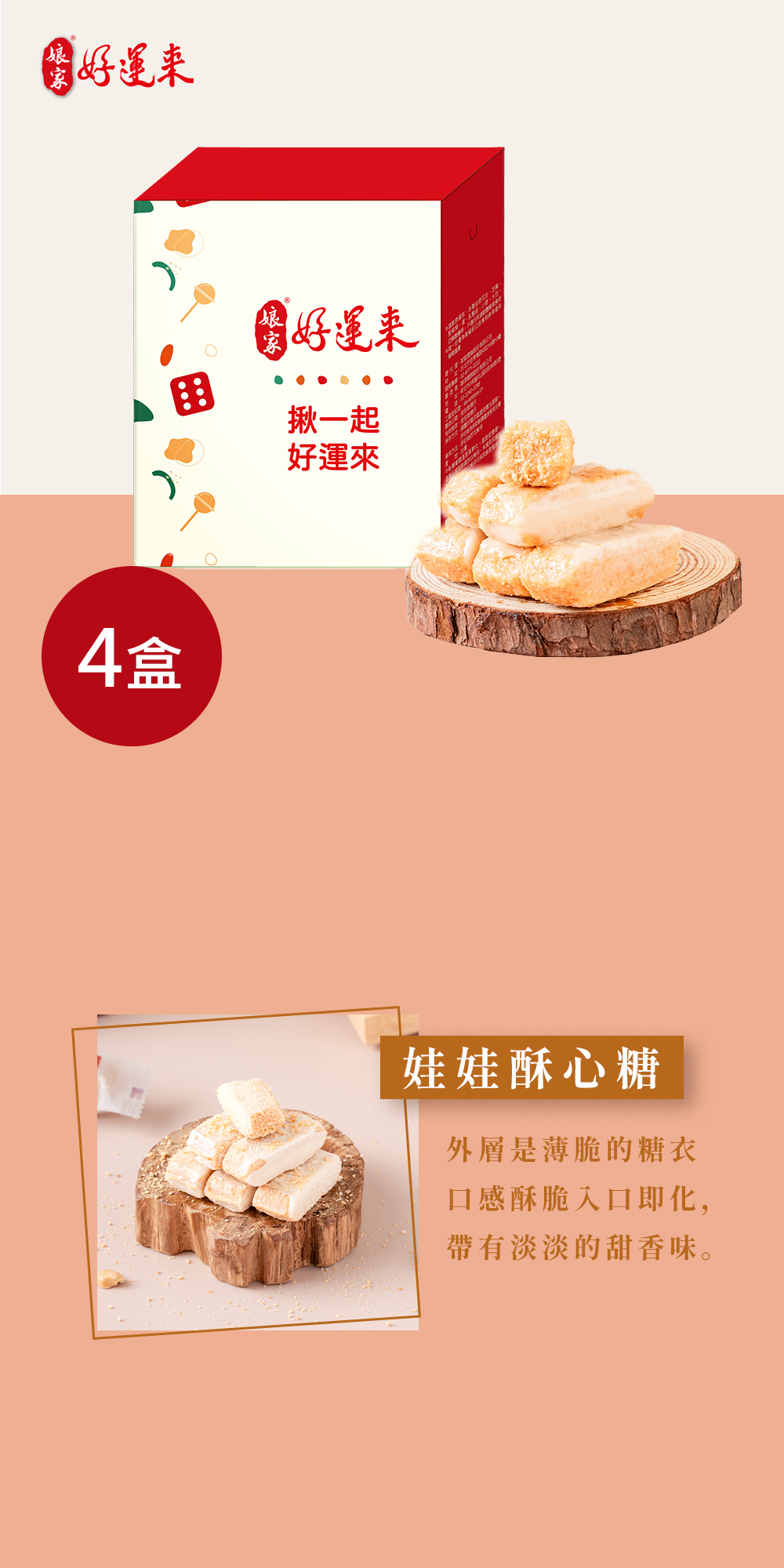 商品規格商品名稱:《娘家好運來》娃娃酥心糖(150g/盒),共4盒規格:150g/盒,共4盒成份:麥芽糖、花生醬、花生粉、蔗糖、食鹽保存期限:120天產地:台灣葷素標示:純素保存方式:常溫過敏原資訊:本產品生產設備亦處理花生、芝麻、堅果類、蛋、乳製品、小麥、大豆等,不適合其過敏體質者食用建議食用方式:開封即食
