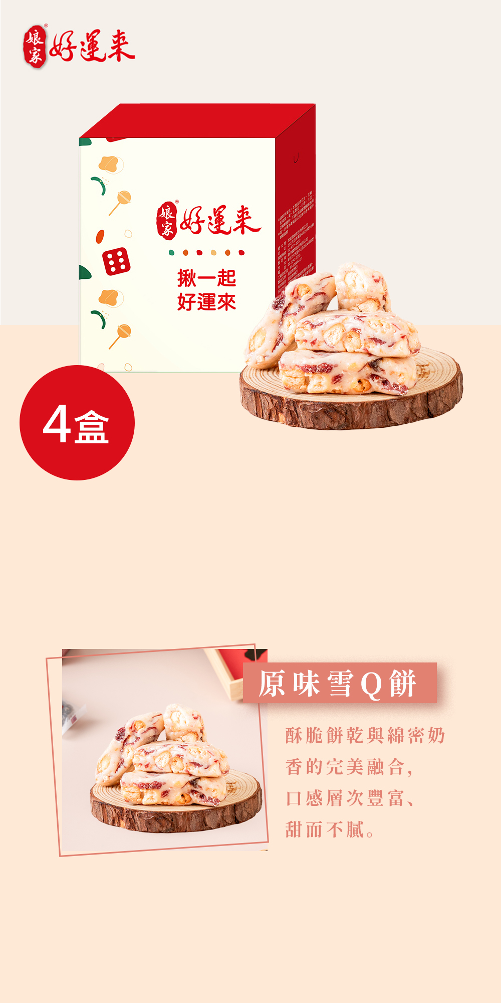 商品規格商品名稱:《娘家好運來》原味雪Q餅(100g/盒),共4盒規格:100g/盒,共4盒成份:麥芽糖、餅乾(小麥麵粉、砂糖、人造奶油〔棕櫚油、乳化劑脂肪酸甘油脂)、香料)、乳清粉 、葡萄糖、鹽、紅麴粉、膨脹劑(碳酸氫銨、碳酸氫鈉、偏亞硫酸氫鈉)、高級白巧克力鈕釦(完全氫化棕櫚仁油、蔗糖、脫脂奶粉、乳糖 、可可脂、大豆卵磷脂、乳化劑(脂肪酸甘油脂、脂肪酸蔗糖酯)、香莢蘭醛)、奶粉 蔓越莓、蛋白、奶油、食鹽、乳化劑(脂防酸甘油脂)保存期限:120天產地:台灣葷素標示:蛋奶素保存方式:常溫過敏原資訊:本產品含花生、芝麻、堅果類、蛋、乳製品、小麥、大豆等,不適合其過敏體質者食用建議食用方式:開封即食