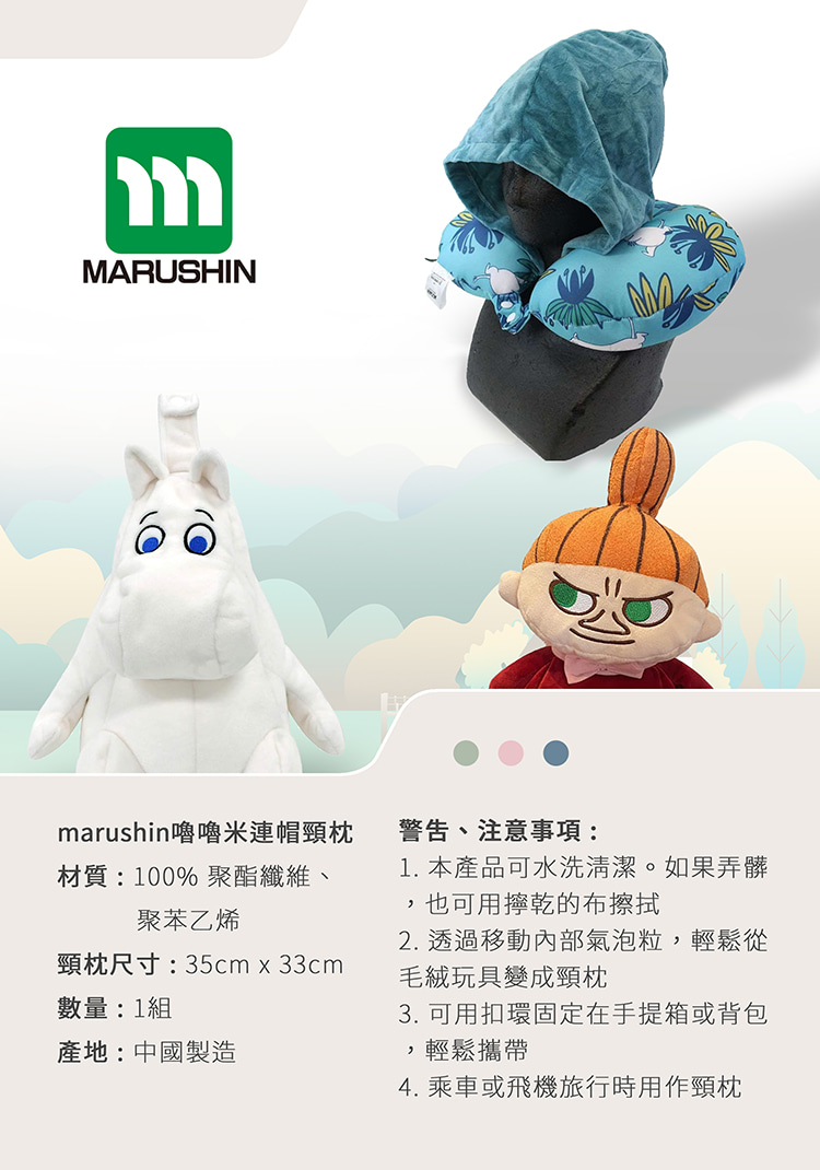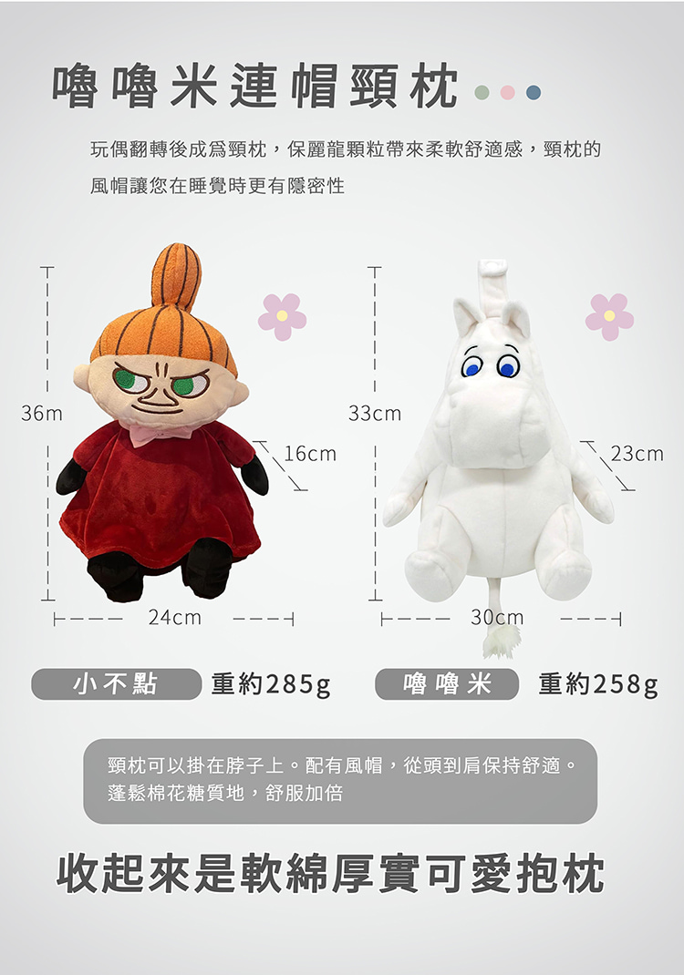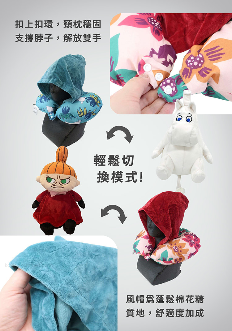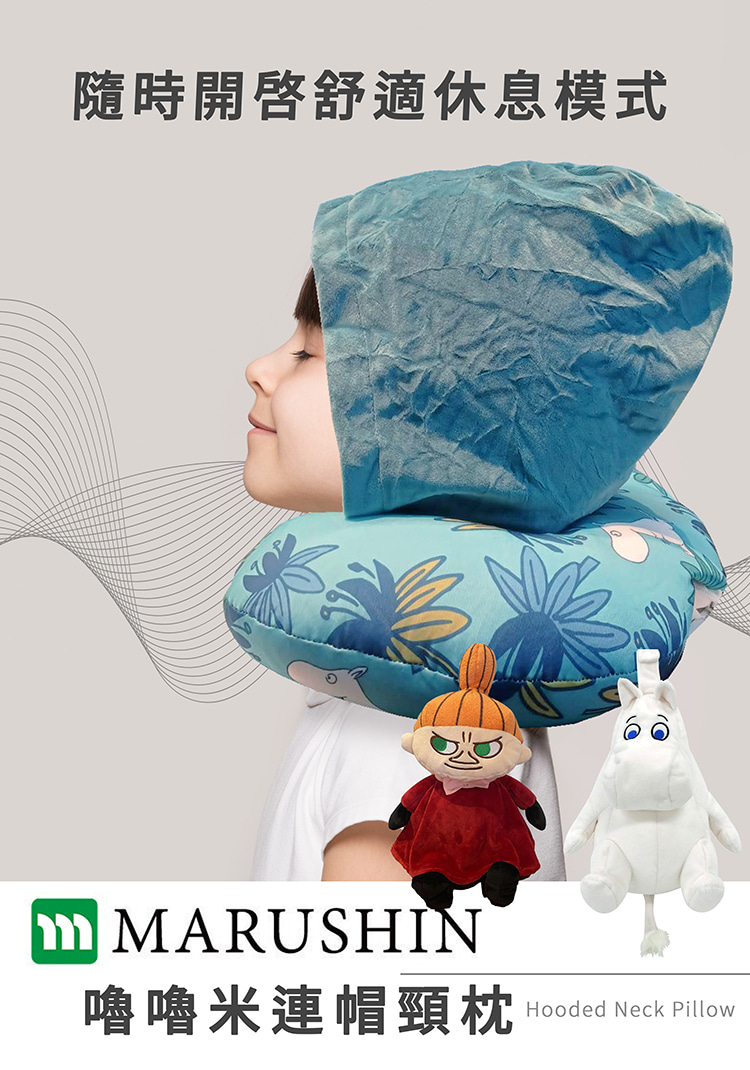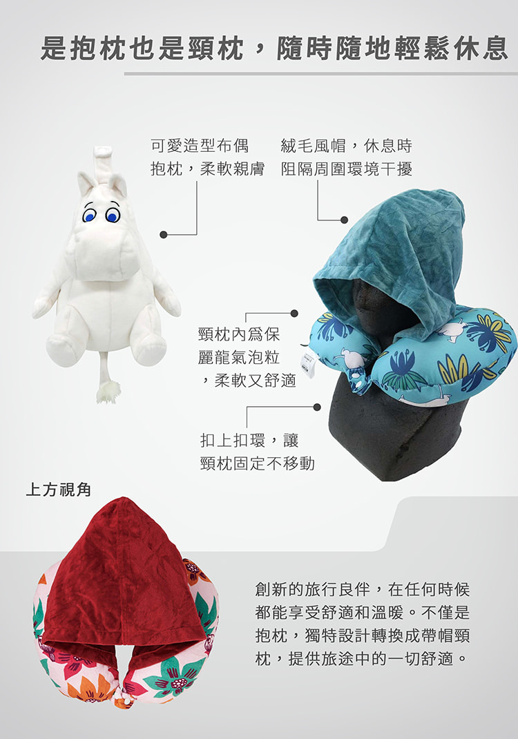 可愛嚕嚕米造型抱枕,也是旅行良伴連帽頸枕 !