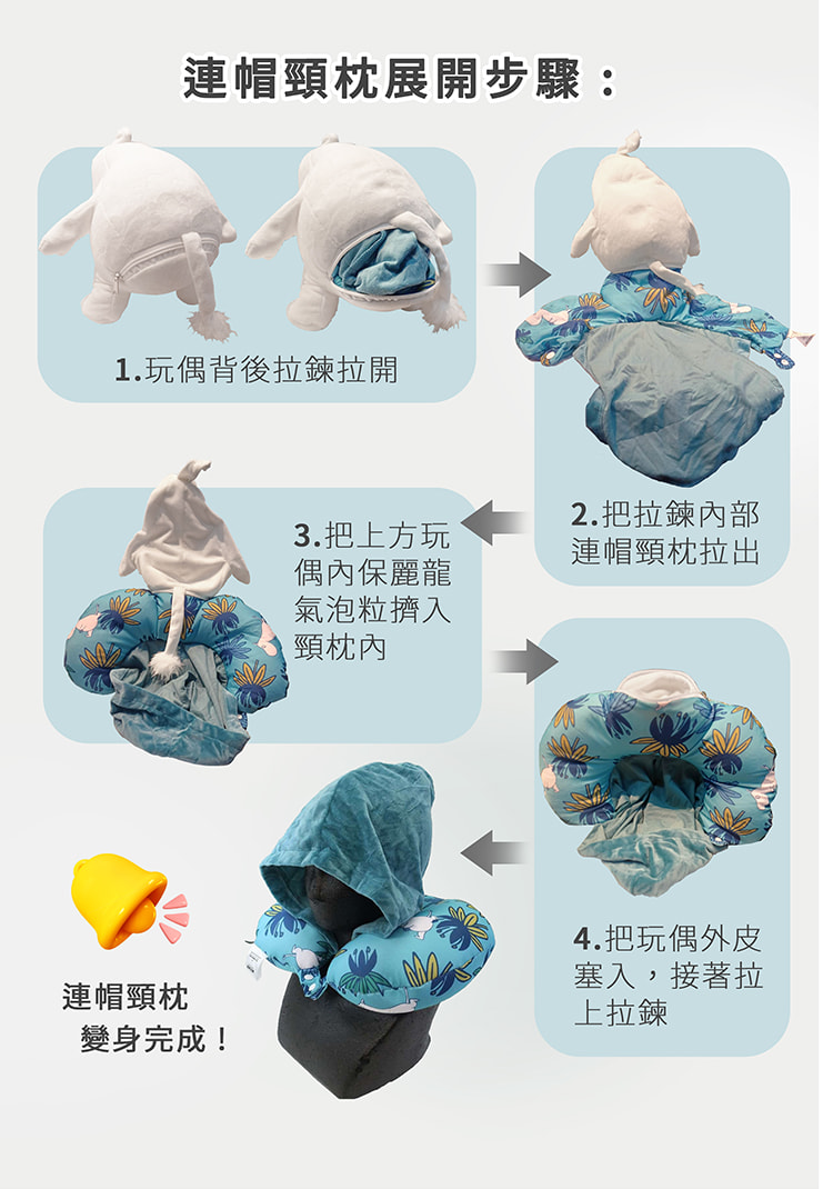 玩偶翻轉後成為頸枕--內部保麗龍顆粒帶來柔軟舒適感,頸枕的風帽讓您在睡覺時更有隱密性