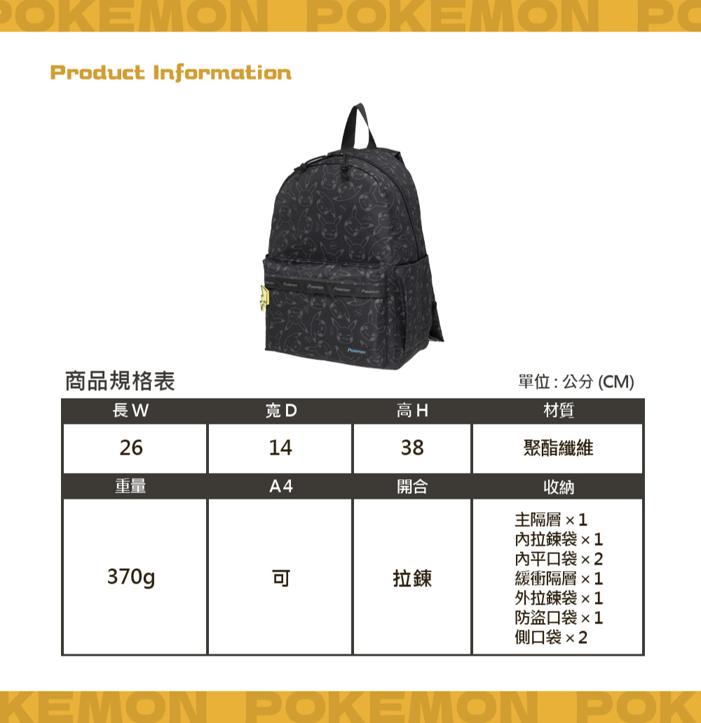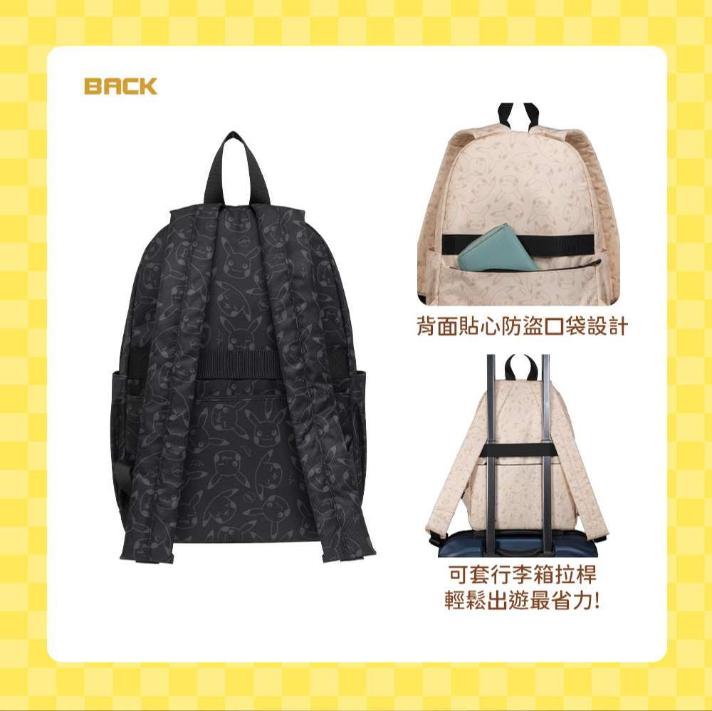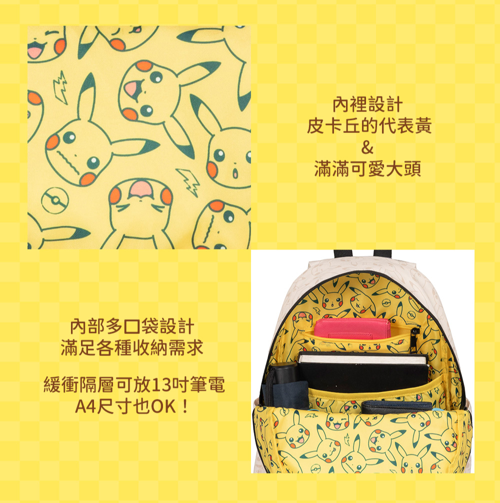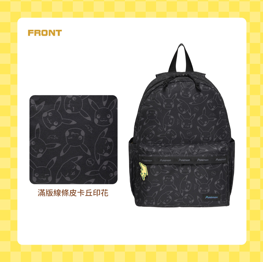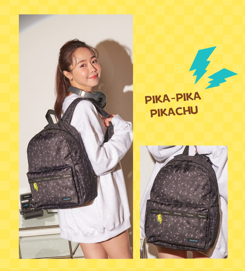 寶可夢超人氣「皮卡丘」Q萌登場滿版的線條皮卡丘印刷料, 搭配織標LOGO、閃電拉片及文字印刷織帶, 並選用霧黑色五金, 更增添整系列的質感。將皮卡丘最具代表性的黃色設計在內部, 多種表情豐富可愛, 打開包包就能帶來繽紛的好心情。中性百搭的設計, 讓喜歡寶可夢的粉絲, 日常上班、出遊穿搭都合適。