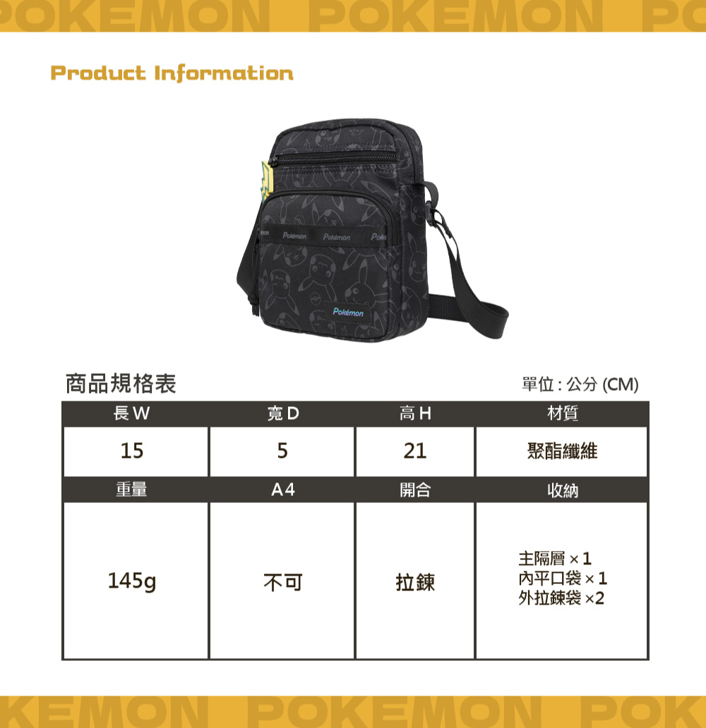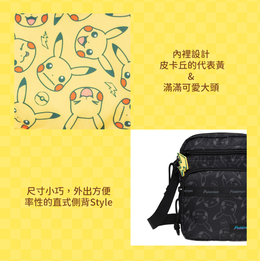 寶可夢超人氣「皮卡丘」Q萌登場滿版的線條皮卡丘印刷料, 搭配織標LOGO、閃電拉片及文字印刷織帶, 並選用霧黑色五金, 更增添整系列的質感。將皮卡丘最具代表性的黃色設計在內部, 多種表情豐富可愛, 打開包包就能帶來繽紛的好心情。中性百搭的設計, 讓喜歡寶可夢的粉絲, 日常上班、出遊穿搭都合適。