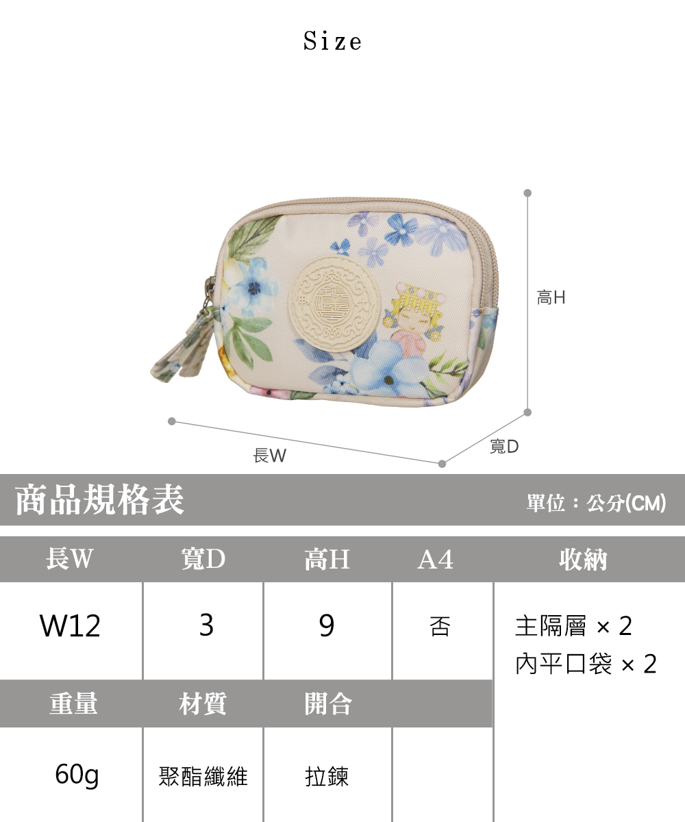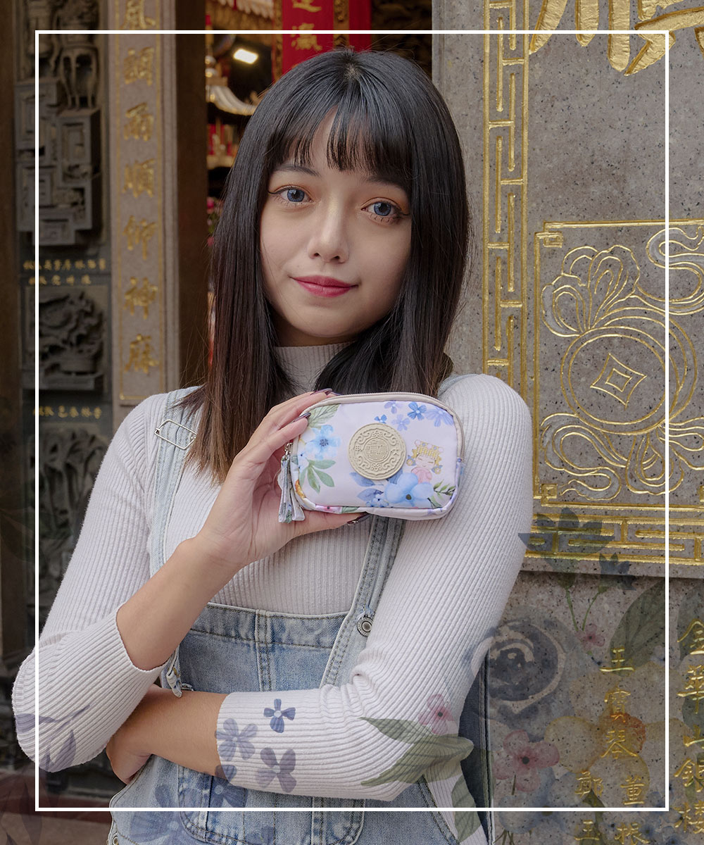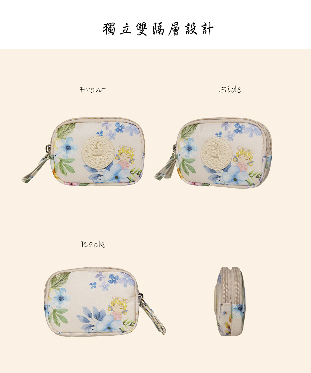 - 大甲鎮瀾宮立體宮徽- 融合柔美花卉與Q版媽祖的典雅印花- 獨立雙隔層設計- 隨身小物分類收納超便利商品規格- 長寬高:12×3×9cm- 重量:60g