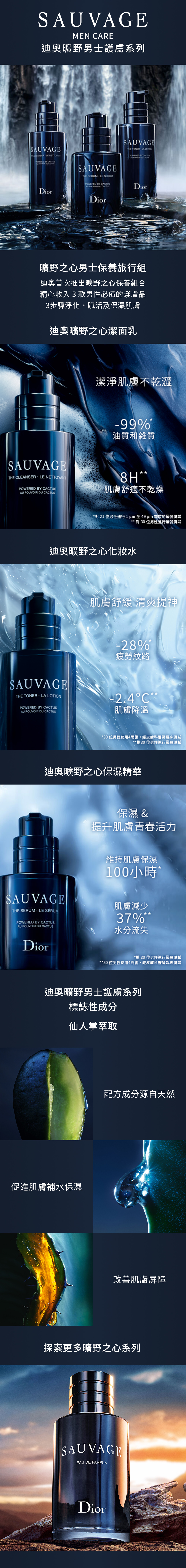 - 步驟3,保濕:《迪奧SAUVAGE曠野之心保濕精華》,有效強化肌膚屏障,維持肌膚保濕達100¹小時,同時提升肌膚青春活力。