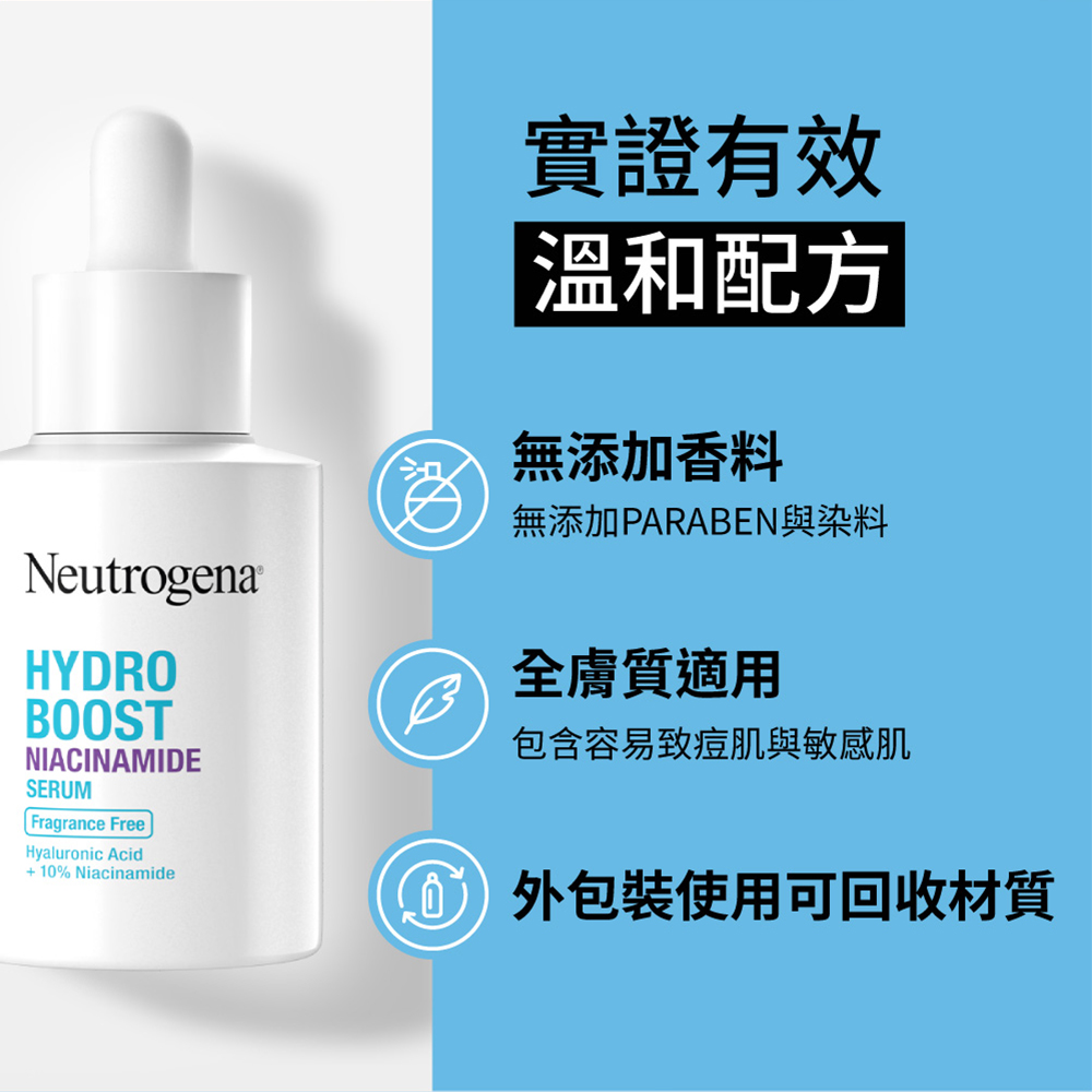 露得清水活保濕菸鹼醯胺精華揭開肌膚清透、散發健康光澤的秘密!配方含菸鹼醯胺(Niacinamide)與玻尿酸(透明質酸),能輕柔去除角質,撫平毛孔,透亮膚色,還有助於強化肌膚保濕屏障,有效改善毛孔粗大、油性肌膚、膚色暗沉及不均。無添加香精配方。-玻尿酸(透明質酸):保持肌膚水分,提供保濕效果-菸鹼醯胺(維他命B3)Niacinamide:光滑肌膚,改善膚色不均-氨基葡萄糖 Neoglucosamine:幫助肌膚澎潤飽滿,均勻膚色--------------------------------------------------無添加香精! 敏弱肌皆適用! 超輕盈水乳質地,上臉輕透水潤好推勻;推開之後,迅速吸收不黏膩。·玻尿酸: 長效水感保濕,有效補水·維生素原B5: 加強肌膚保濕屏障,持續為肌膚鎖水·抗老化物(維他命C和E): 有效防護紫外線引起的肌膚老化·全新Helioplex®SL高效隔光科技:有效抵抗紫外線引起曬紅曬傷的UVB、曬黑的UVA和長波紫外線·適合妝前乳使用,保濕透亮上妝服貼不打架■裸膚感不泛白 ■抗水抗汗配方 ■經眼部測試 ■不易致粉刺配方 ■敏弱肌適用---------------------------------------------------[露得清®A醇產品系列] 萬眾期待 強勢登場!7天撫平7大皺紋* 鎖住青春肌淡化暗沉 X 透亮緊緻 X 溫和保濕不易刺激露得清®肌緻新生A醇乳霜,質地滋潤保濕,溫和安撫精萃降低刺激性,每日使用OK!A醇新手也適用!.適用於一般肌、乾性肌露得清®肌緻新生A醇眼霜,淡化眼周細紋和黑眼圈,溫和安撫精萃降低刺激性,每日使用OK!A醇新手也適用!.精純A醇 : 經皮膚專家證實,有助於淡化細紋、暗沉和皺紋.肌肽 : 鞏固肌膚緊緻度和彈性.溫和安撫精萃 : 減少肌膚不適感*面頰細紋、額頭皺紋、眉間皺紋、法令紋、嘴角紋、笑紋、頸紋.所有膚質皆適用.無添加Paraben、無添加礦物油、無添加染料