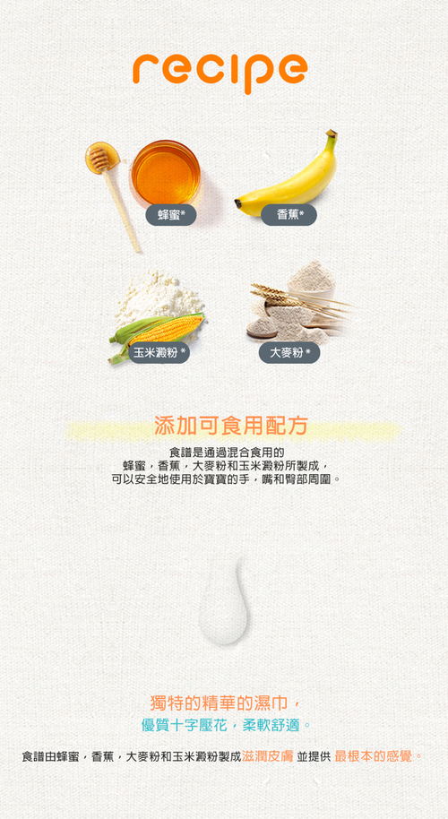 商品特色:✔添加可食用配方(蜂蜜、香蕉、玉米澱粉、大麥粉),100%對嬰兒無傷害✔優質的十字壓花設計,柔軟又舒適✔7階淨化過程,去除殘留離子、殺死細菌、微粒等安全的超純水來製造濕紙巾