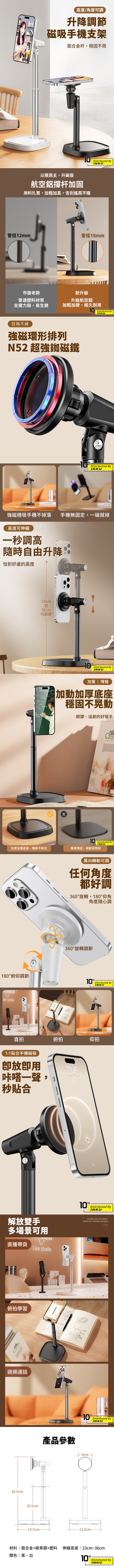 解放雙手 多場景可用直播帶貨/俯拍學習/視頻通話----------------------------------------------產品參數材料:鋁合金+碳素鋼+塑料伸縮高度:23cm~36cm顏色:黑、白
