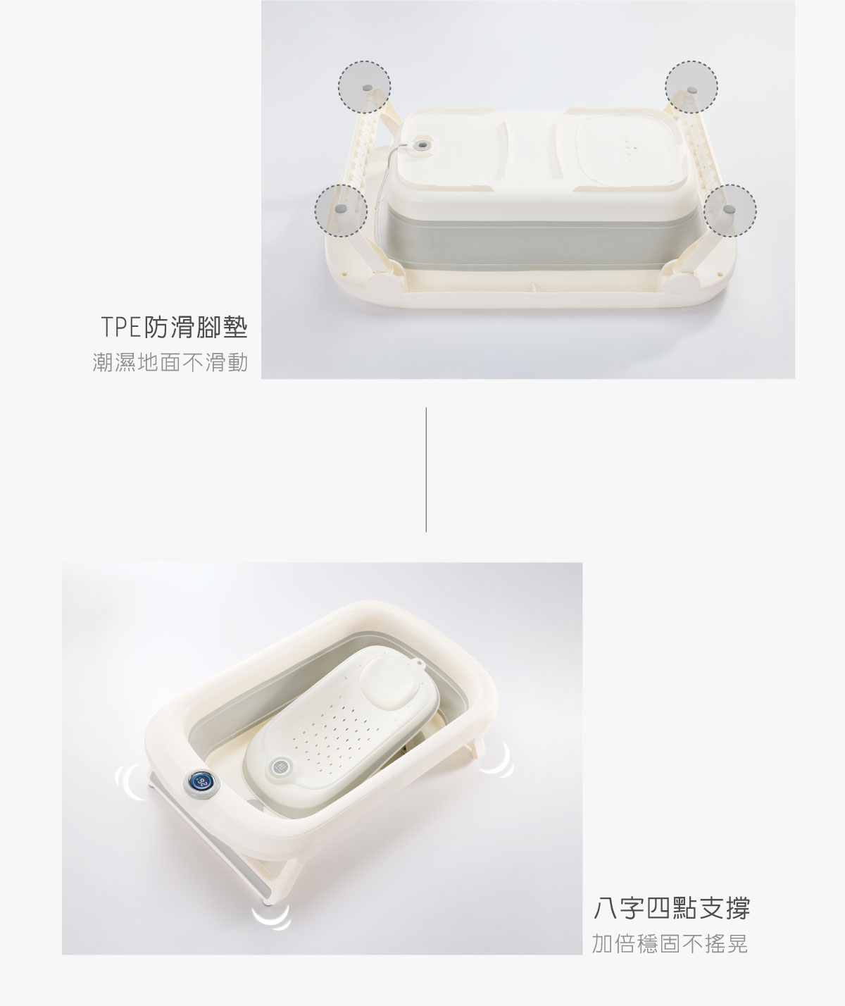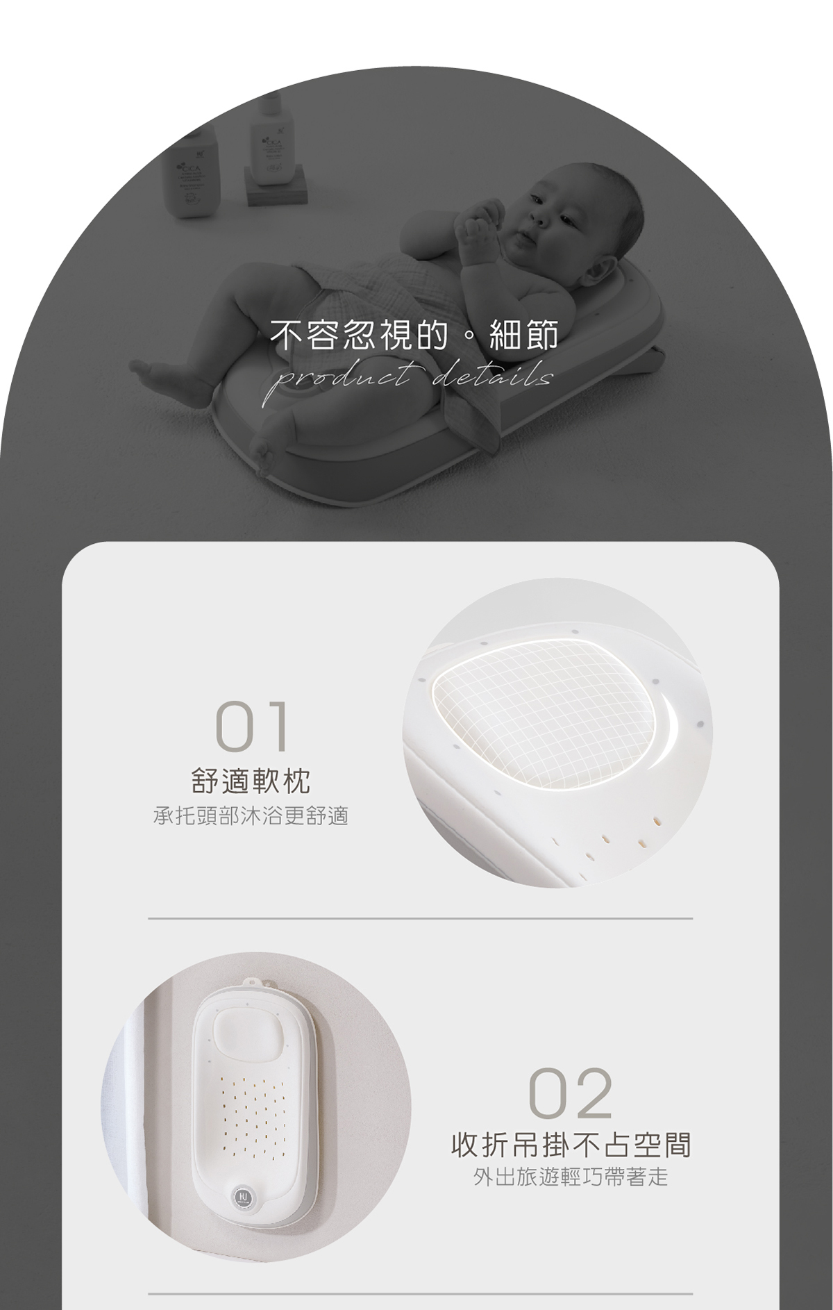 01.舒適軟枕–承托頭部沐浴更舒適02.收折吊掛不占空間–外出旅遊輕巧帶著走03.多網洞排水–快速瀝乾不積水04.360°止滑包覆–增加摩擦力寶貝沐浴更安全