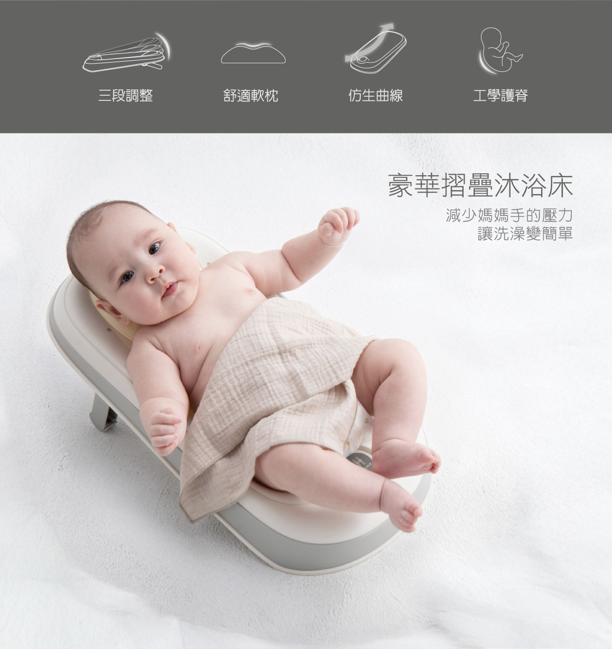 商品特色:酷咕鴨 KUKU PLUS 豪華摺疊沐浴床減少媽媽手的壓力 讓洗澡變簡單優雅洗澡‧舒適沐浴三段調整、舒適軟枕、仿生曲線、工學護脊流線型仿生曲線沐浴中享受被包裹的安全感彈性椅背溫柔承托寶寶小背脊三檔高度調節平躺、斜躺、臥躺適用不同成長階段的寶寶不怕寶寶嗆到水場地不受限隨放隨洗快速洗屁屁低矮平面躺著水洗更安全