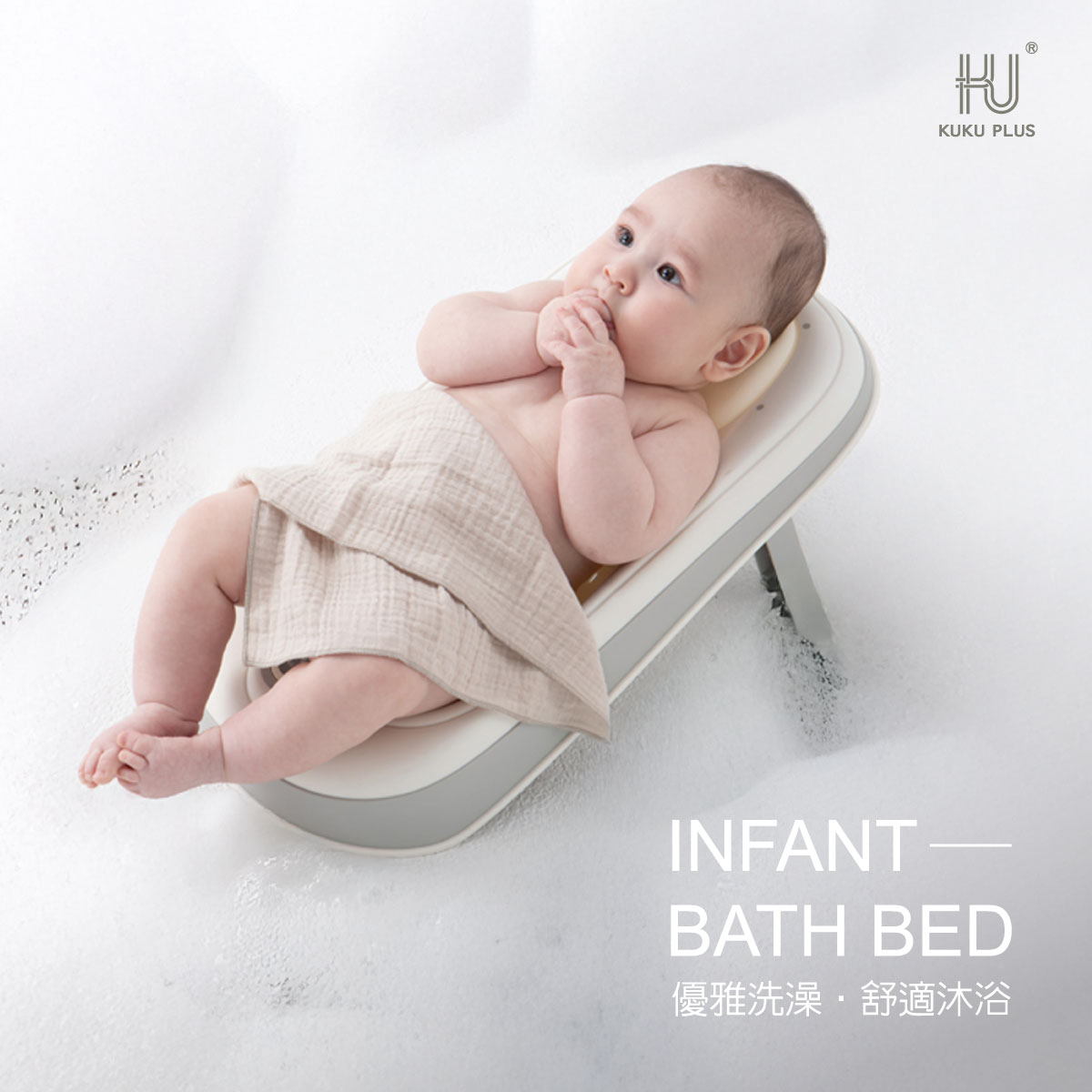 KUKU PLUS 豪華型感溫折疊浴盆,採用LED三色變光感溫設計,可自動偵測水溫在不同範圍內呈現藍、綠、紅三種顏色,隨時掌握寶寶洗澡溫度, 折疊式設計方便小宅收納,節省浴室放置空間;KUKU PLUS豪華摺疊沐浴床可三段式調整傾斜角度且方便收納,節省浴室放置空間,流線型仿生曲線溫柔承托未發育的背脊,讓寶貝在沐浴中享受被包裹的安全感,讓每次沐浴都成為親子共度的美好時光!