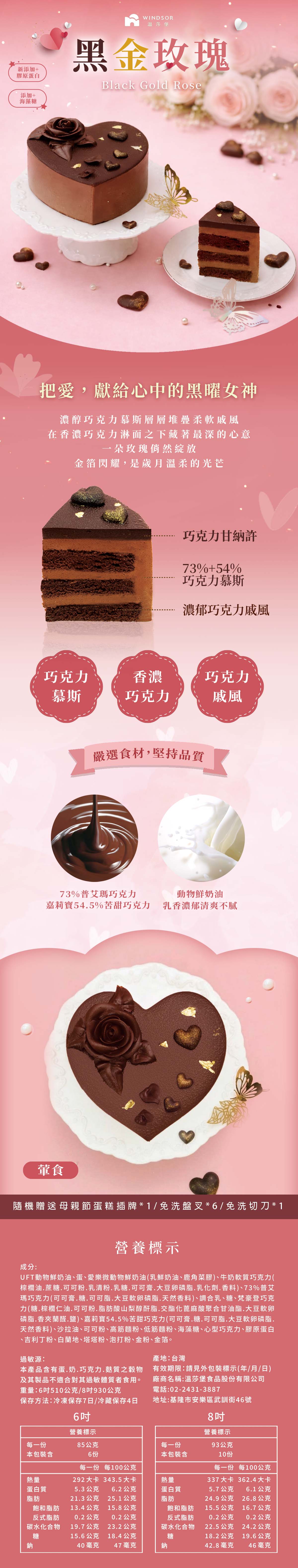 愛心造型設計,玫瑰與金箔心形巧克力點綴,低調奢華,嚴選歐洲73%普艾瑪、嘉麗寶54.5%及梵豪登三款巧克力交織,在微苦與醇香之間,展現濃郁馥郁、絲滑順口的層次;並添加海藻糖調節甜度及膠原蛋白讓美味與養顏兼具。今年母親節 把愛,獻給心中的 黑曜女神。