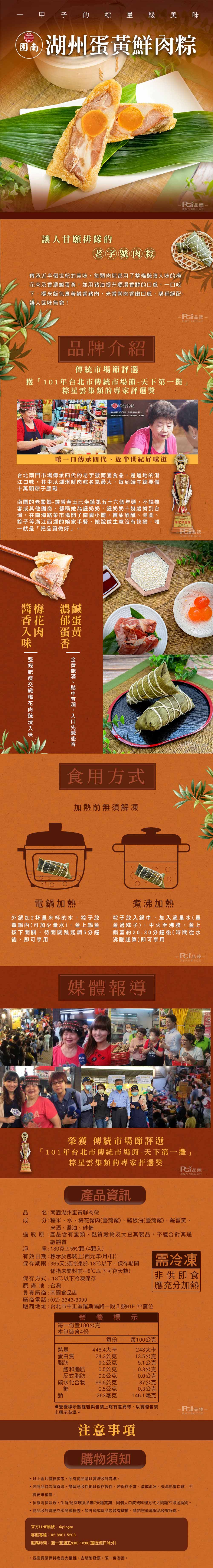 1.商品組合/規格:【南園】湖州鮮肉蛋黃粽(4顆/包)2.商品品名:【南園】湖州鮮肉蛋黃粽(4顆/包)3.成分:糯米、水、梅花豬肉(臺灣豬)、豬板油(臺灣豬)、鹹蛋黃、米酒、醬油、綿糖、鹽※本產品含有蛋類、大豆及小麥其製品,不適合對其過敏體質者食用4.商品重(容)量:180g±5%/顆*4顆5.原產地(國):台灣6.保存期限:-18℃以下冷凍 1年(實際依商品包裝標示)7.製造廠商或國內負責廠商名稱:品臻國際行銷有限公司8.製造廠商或國內負責廠商地址:台北市中山區民生東路一段43號7樓9.製造廠商或國內負責廠商電話:02-8861-520810.食品業者登錄字號:A-127757268-00000-211.投保產品責任險字號:富邦產物0510字第26AML0000235號