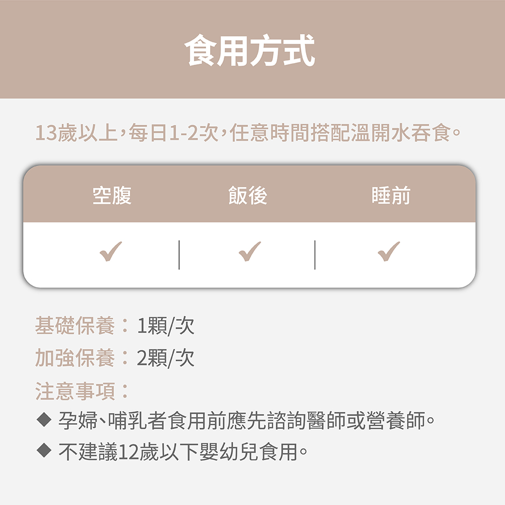 ➤每日1-2次,每次1-2顆,任意時間搭配溫開水食用