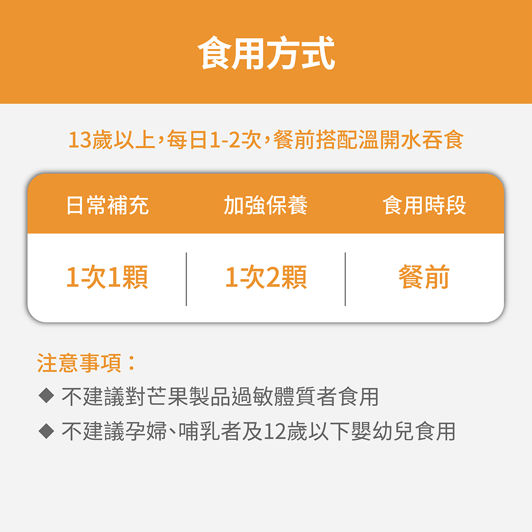 ➤每天1-2次,每次1-2顆,餐前搭配溫開水食用