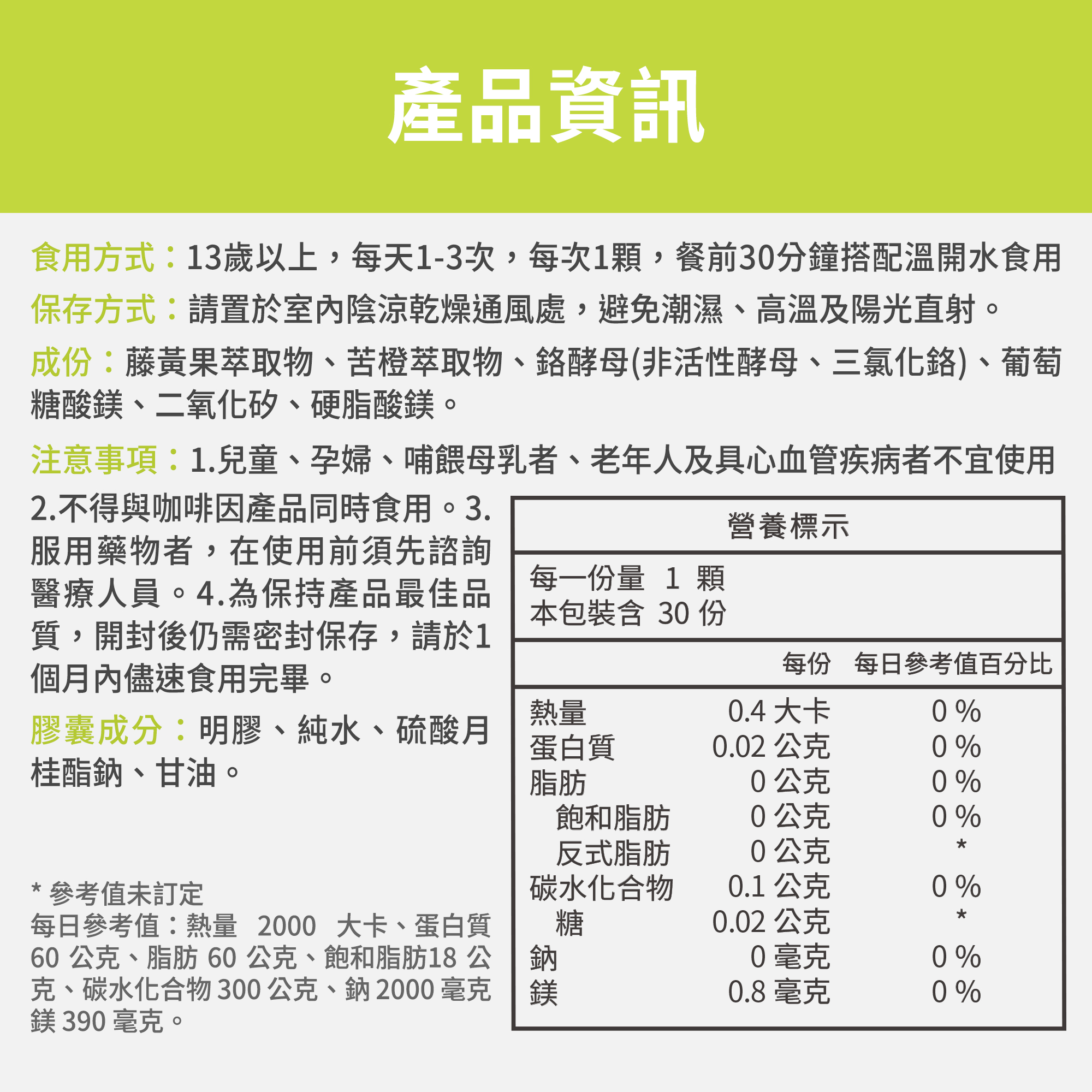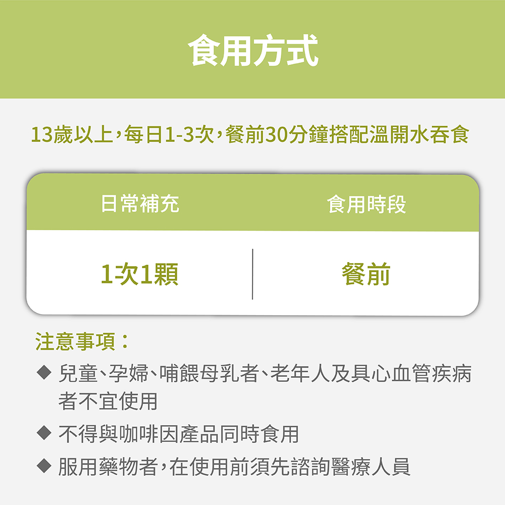 ➤每天1-3次,每次1顆,餐前搭配溫開水食用