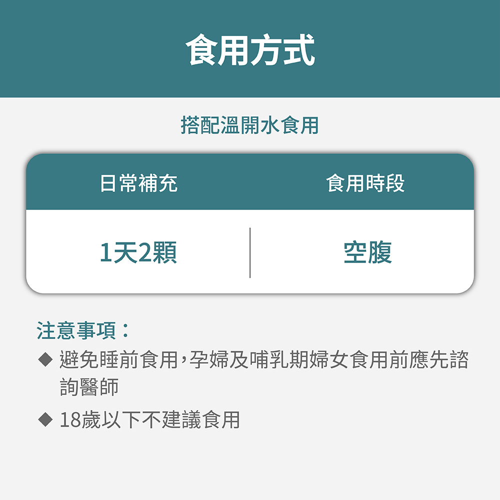 ➤每日2顆,於空腹時搭配溫開水食用。