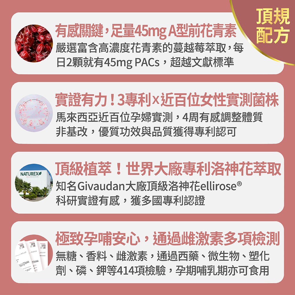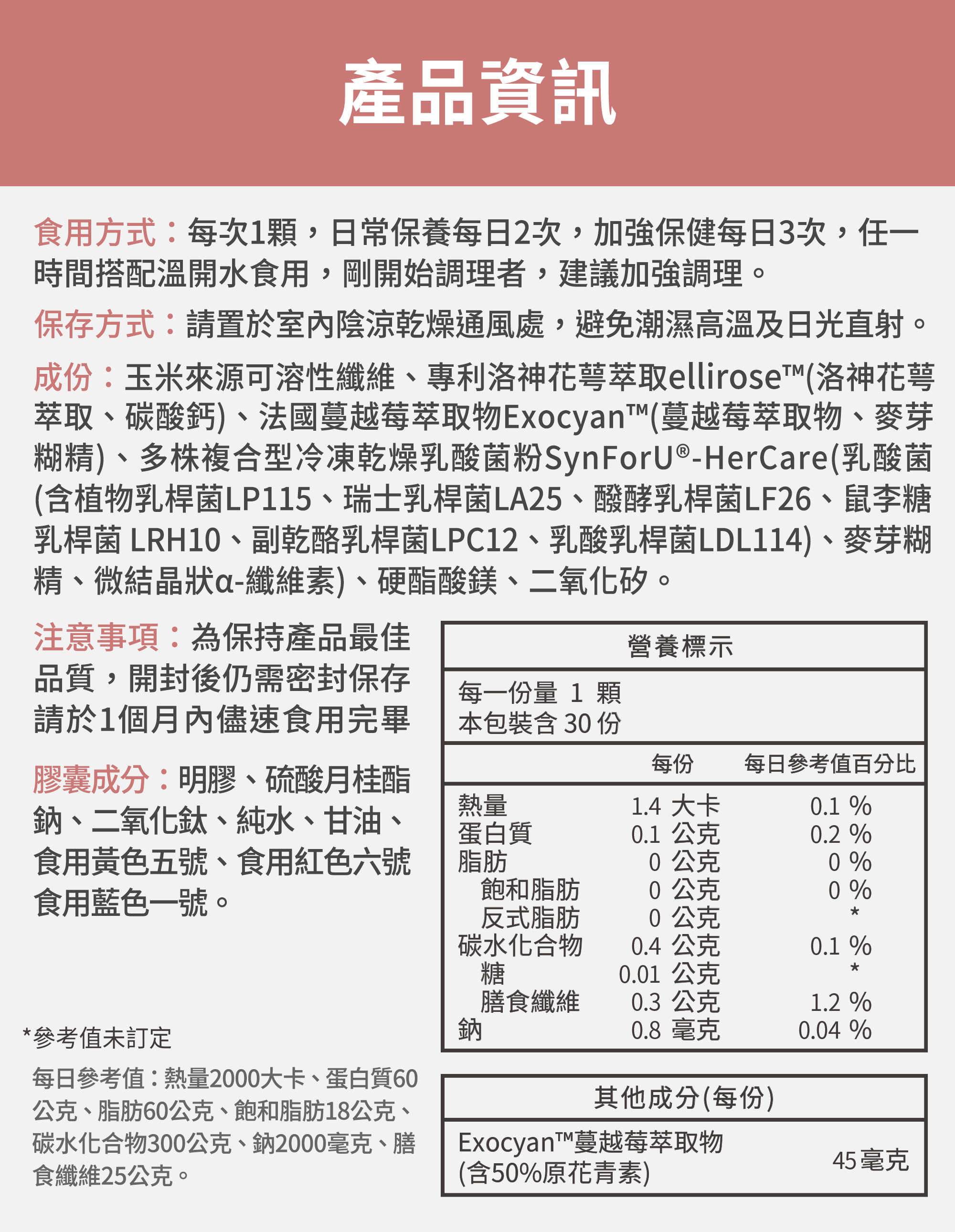 包含專利洛神花萼萃取ellirose™、法國蔓越莓萃取物Exocyan™、多株複合型冷凍乾燥乳酸菌粉SynForU®-HerCare(乳酸菌(植物乳桿菌 LP115、瑞士乳桿菌LA25、醱酵乳桿菌 LF26、鼠李糖乳桿菌 LRH10、副乾酪乳桿菌LPC12、乳酸乳桿菌LDL114)等,完整成分請看下方成分表喔。