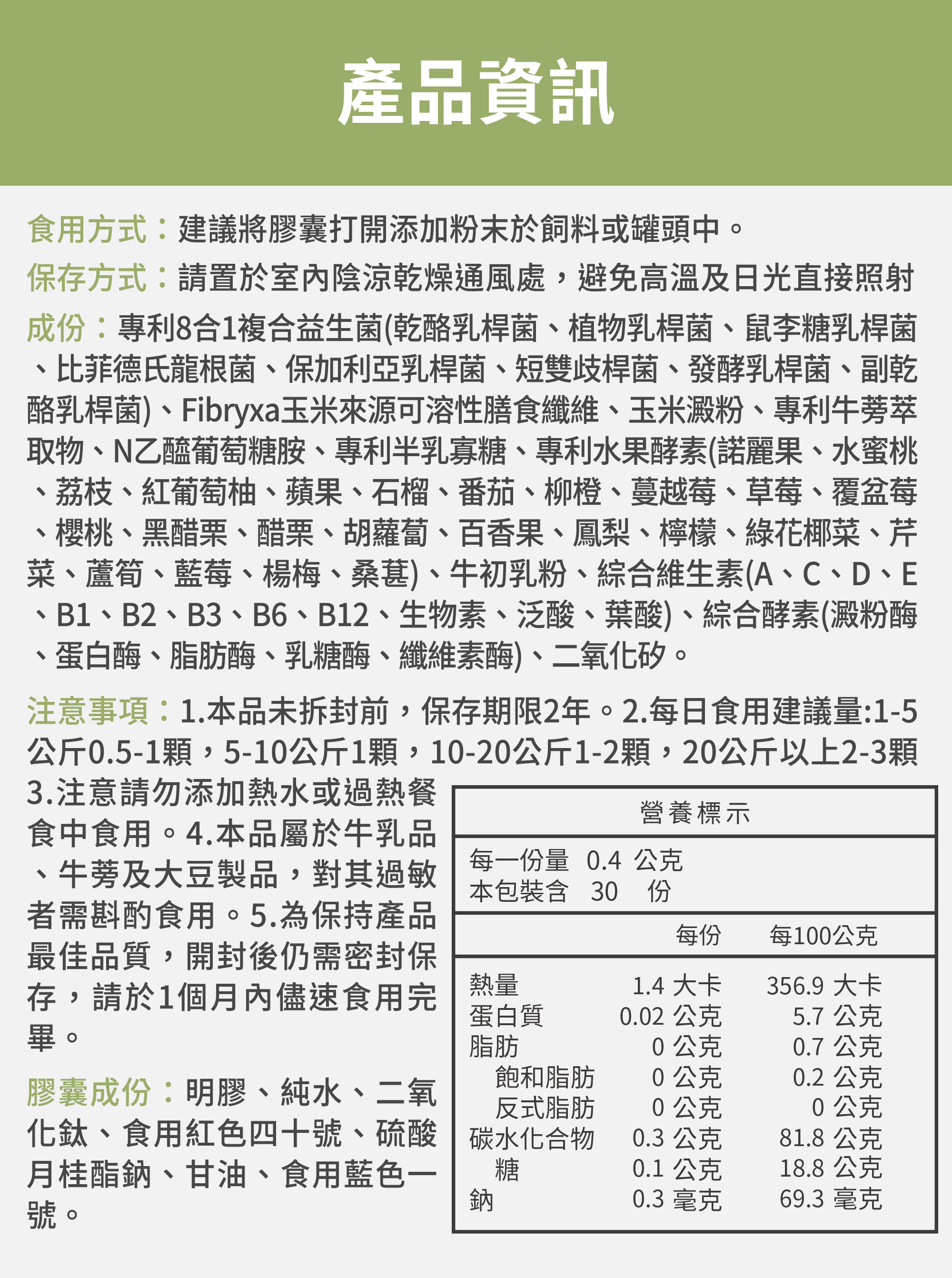 ➤首創寵物全能精華-腸胃調理、綜合營養、骨骼、免疫