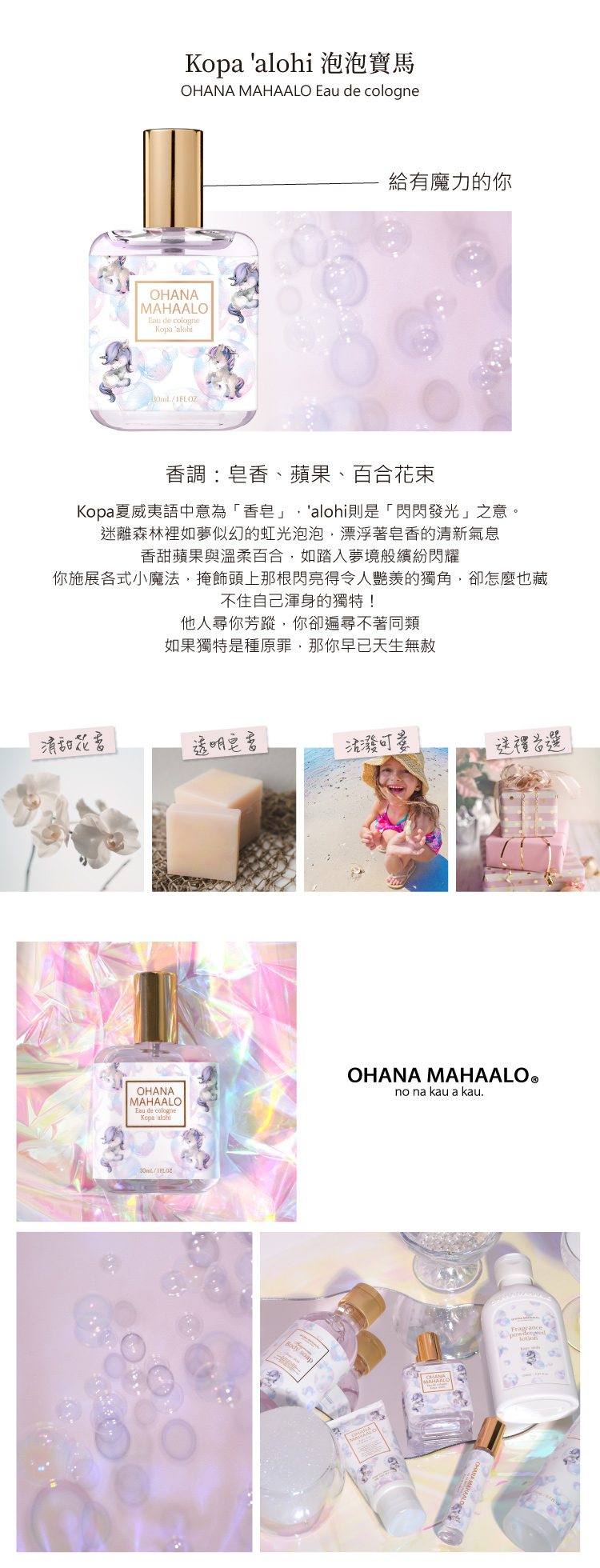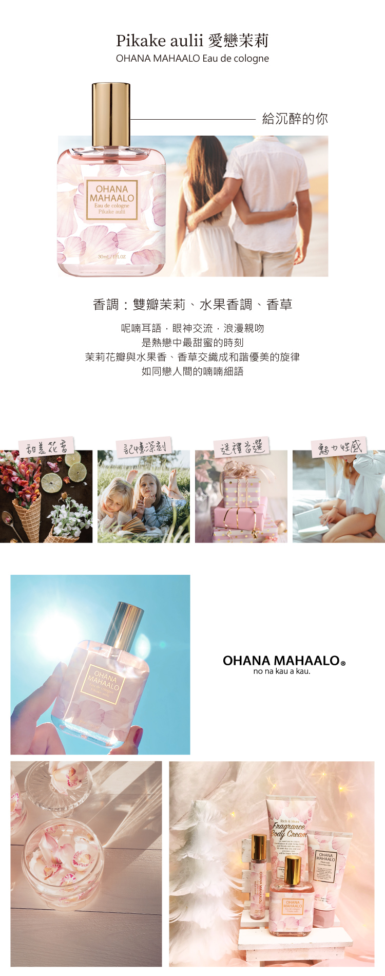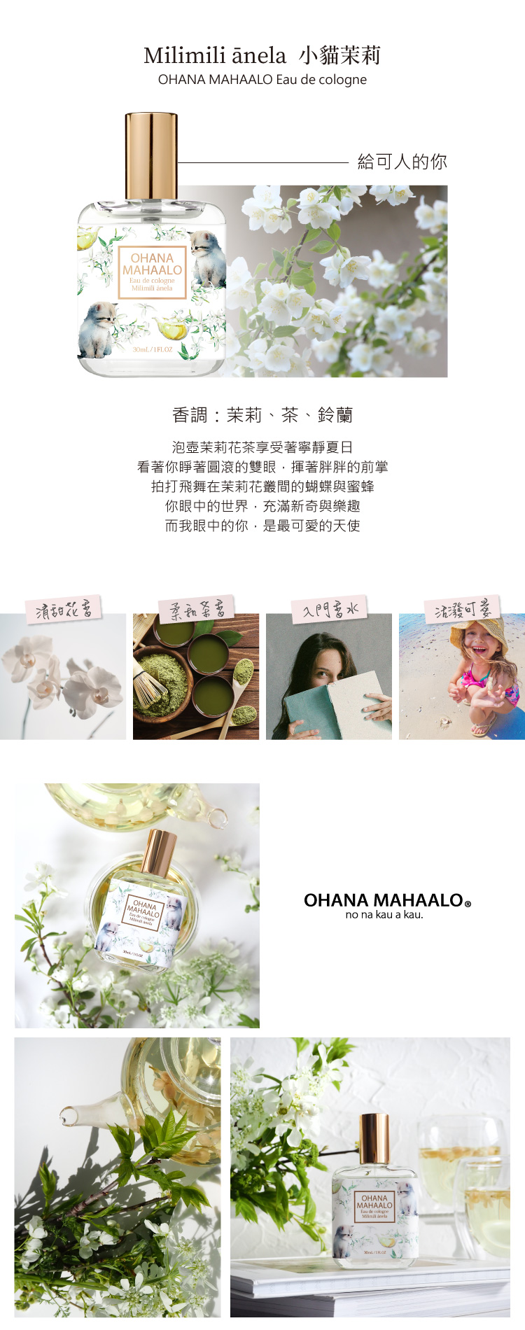 OHANA MAHAALO 愛戀茉莉 輕香水30ml:雙瓣茉莉、水果香調、香草OHANA MAHAALO 幸福花雨 輕香水30ml:風信子、茉莉、麝香OHANA MAHAALO 奇幻夢境 輕香水30ml:花香調、綜合水果香調、琥珀OHANA MAHAALO 日暖洋洋 輕香水30ml:葡萄柚、茉莉、麝香OHANA MAHAALO 貓戲春櫻 輕香水30ml:櫻花、小蒼蘭、白百合OHANA MAHAALO 糖霜蘋果 輕香水30ml:蘋果、肉桂、糖香OHANA MAHAALO 杏福時光 輕香水30ml:杏、玫瑰、茉莉OHANA MAHAALO 心有所屬 輕香水30ml:覆盆子、蘋果、橙花OHANA MAHAALO 泡泡寶馬 輕香水30ml:皂香、蘋果、百合花束OHANA MAHAALO 呢喃相守 輕香水30ml:果香、玫瑰、海洋調OHANA MAHAALO 小貓茉莉 輕香水30ml:茉莉、茶、鈴蘭OHANA MAHAALO 雪梅凌霜 輕香水30ml:柑橘、玫瑰、木質香調OHANA MAHAALO 有貝兒來 輕香水30ml:波斯菊、牡丹、茉莉