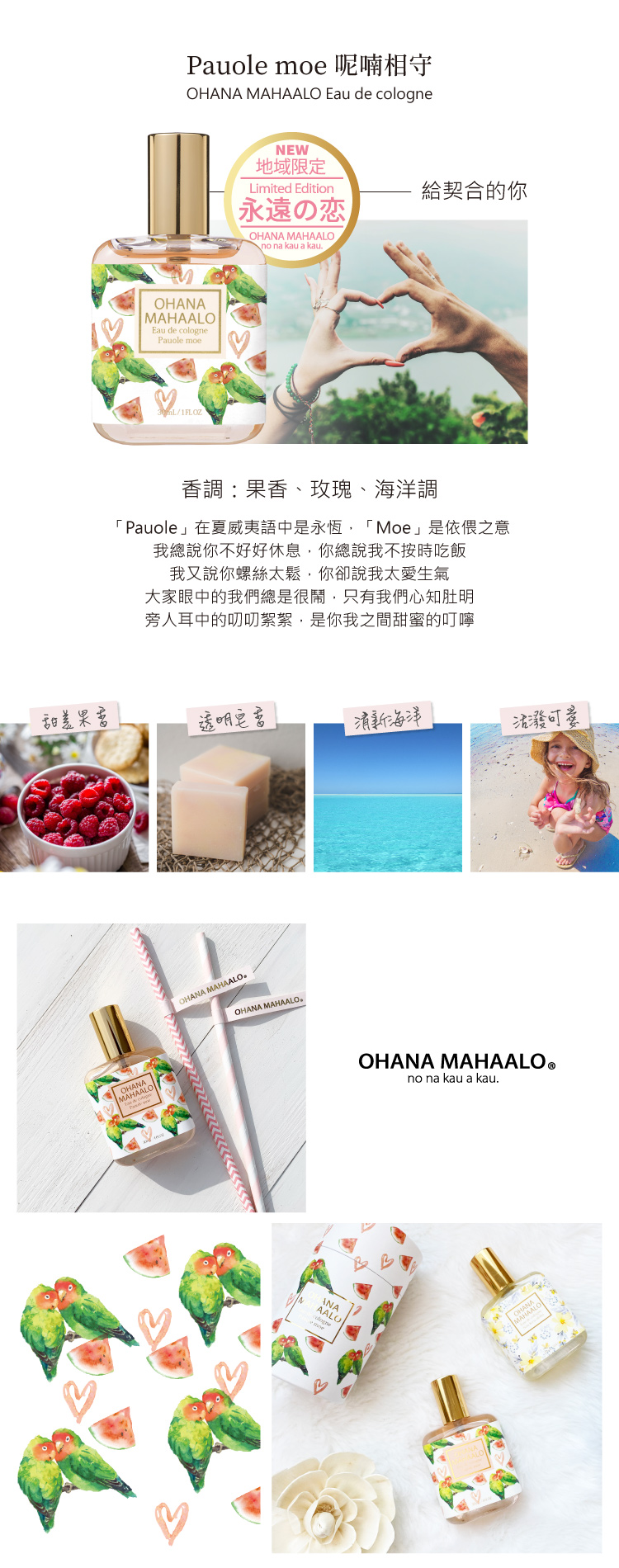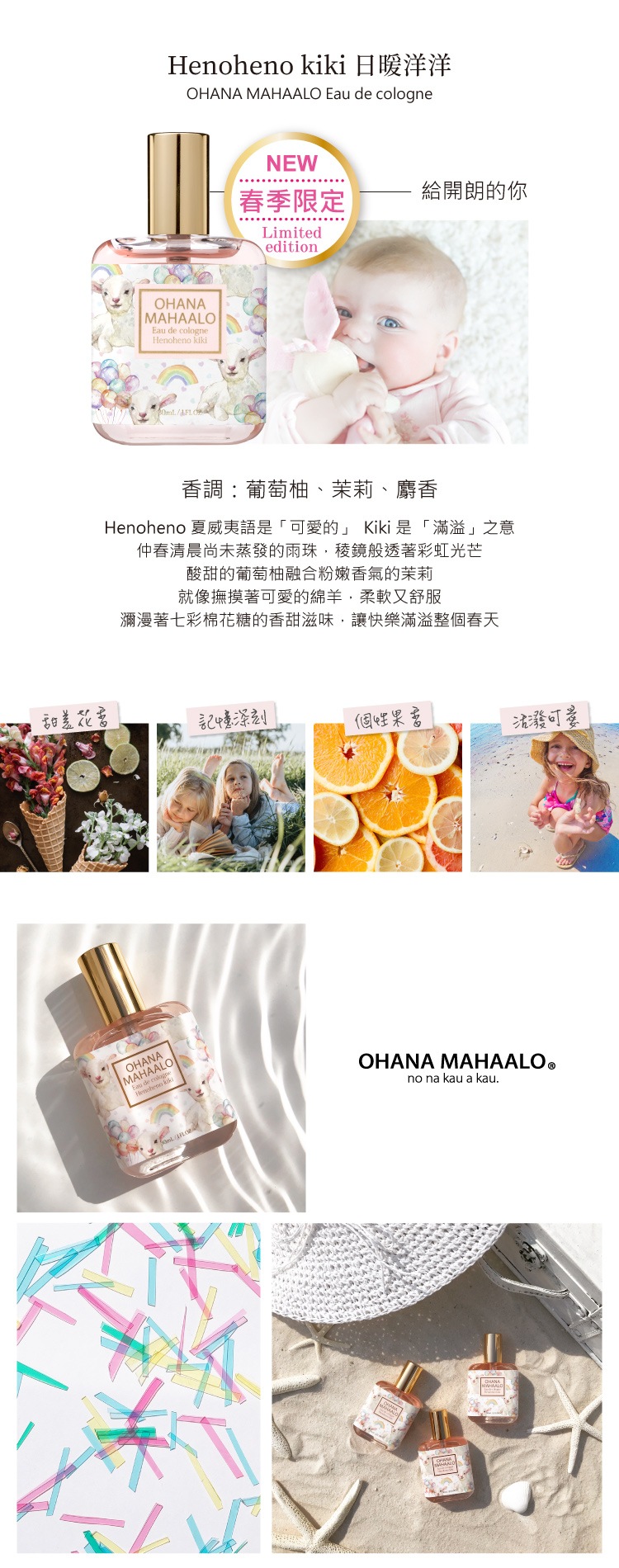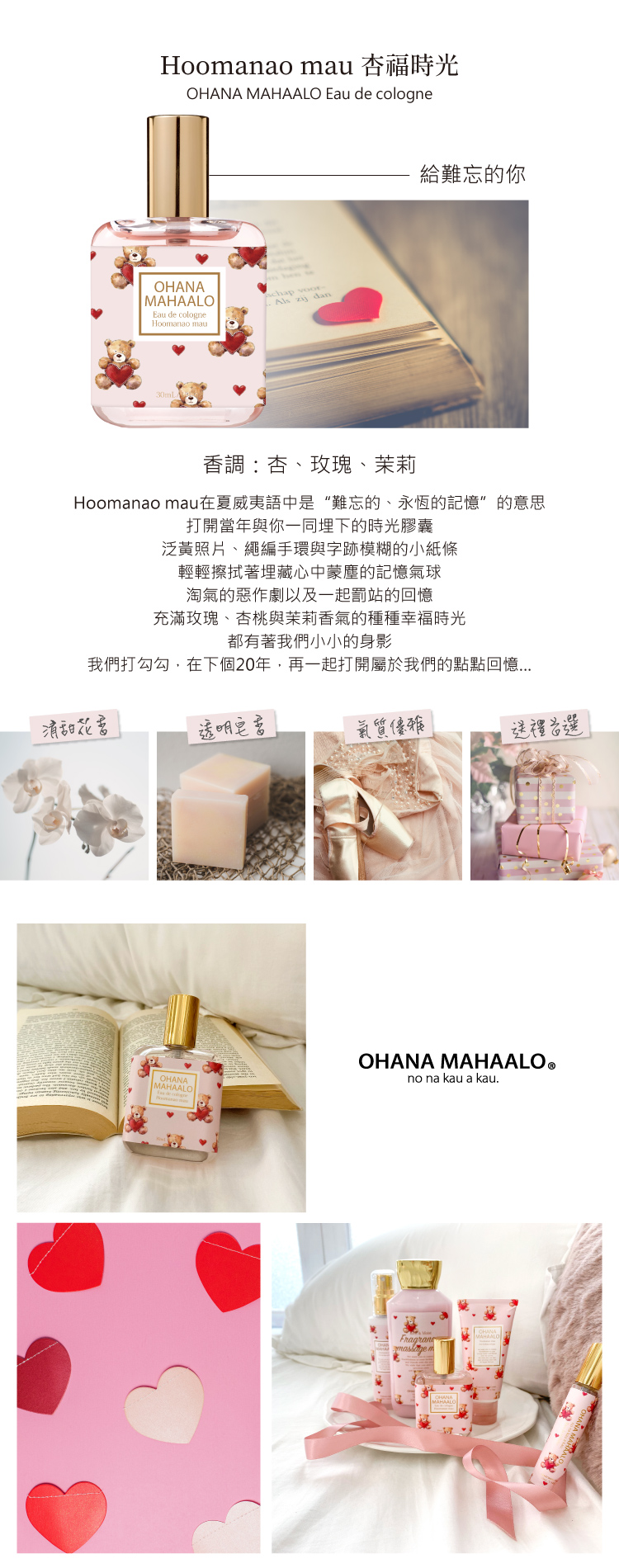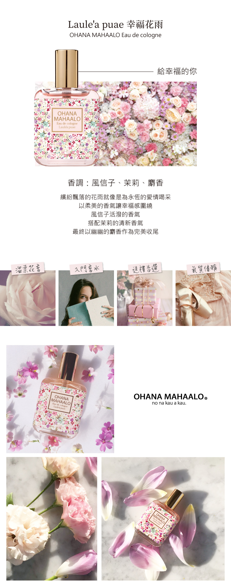 OHANA MAHAALO 愛戀茉莉 輕香水30ml:雙瓣茉莉、水果香調、香草OHANA MAHAALO 幸福花雨 輕香水30ml:風信子、茉莉、麝香OHANA MAHAALO 奇幻夢境 輕香水30ml:花香調、綜合水果香調、琥珀OHANA MAHAALO 日暖洋洋 輕香水30ml:葡萄柚、茉莉、麝香OHANA MAHAALO 貓戲春櫻 輕香水30ml:櫻花、小蒼蘭、白百合OHANA MAHAALO 糖霜蘋果 輕香水30ml:蘋果、肉桂、糖香OHANA MAHAALO 杏福時光 輕香水30ml:杏、玫瑰、茉莉OHANA MAHAALO 心有所屬 輕香水30ml:覆盆子、蘋果、橙花OHANA MAHAALO 泡泡寶馬 輕香水30ml:皂香、蘋果、百合花束OHANA MAHAALO 呢喃相守 輕香水30ml:果香、玫瑰、海洋調OHANA MAHAALO 小貓茉莉 輕香水30ml:茉莉、茶、鈴蘭OHANA MAHAALO 雪梅凌霜 輕香水30ml:柑橘、玫瑰、木質香調OHANA MAHAALO 有貝兒來 輕香水30ml:波斯菊、牡丹、茉莉