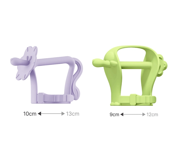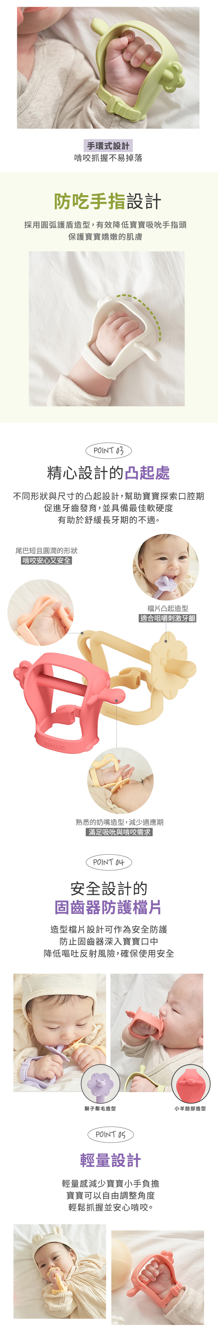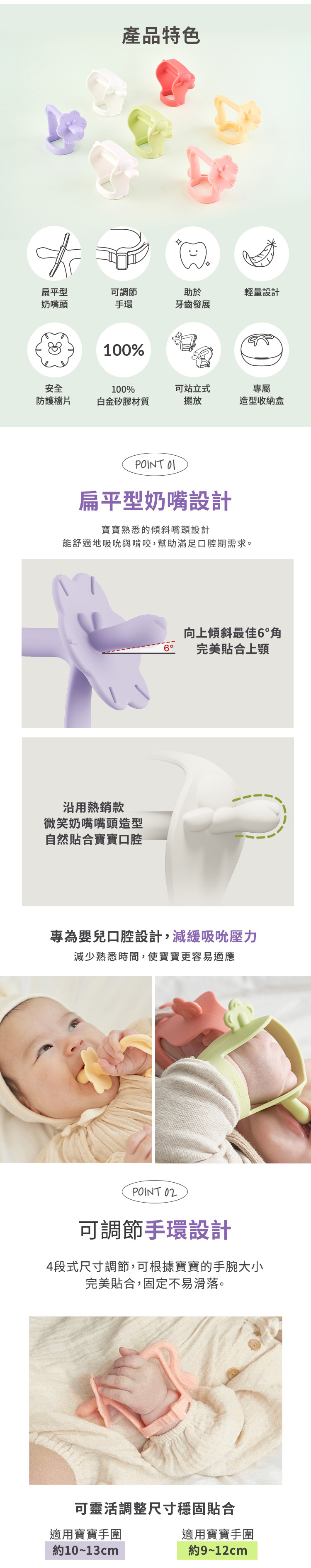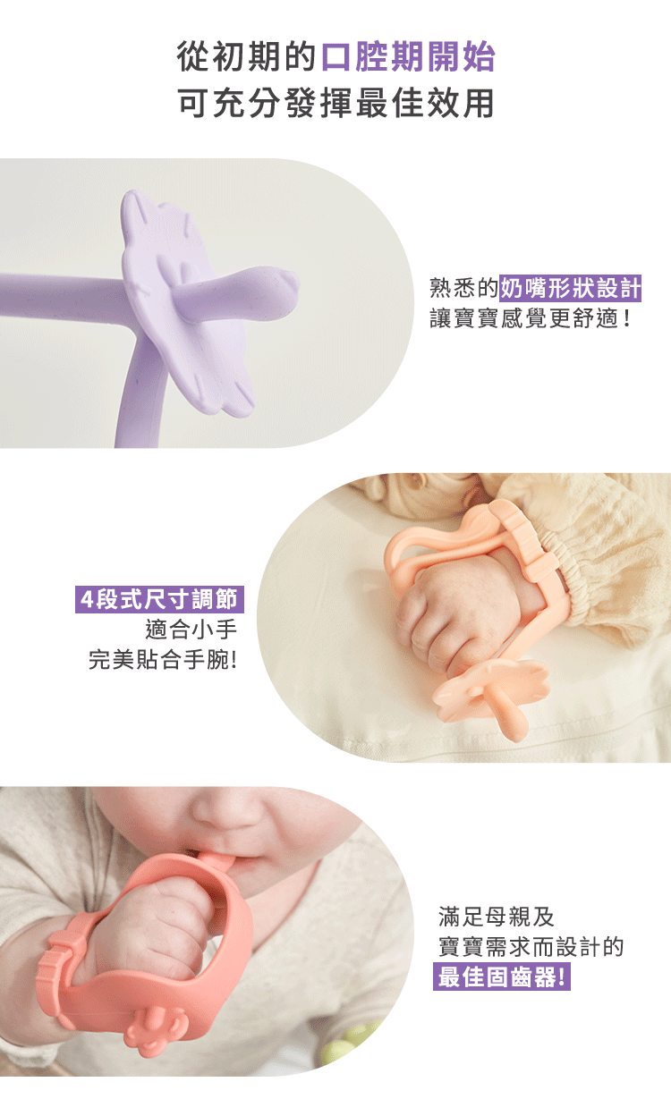 功能性再升級!輕量設計讓寶寶輕鬆習慣的扁平嘴頭及上斜設計可根據寶寶手圍大小做四段調節,啃咬抓握更舒適精心設計的多種凸起處,促進牙齒發展搭配防護檔片,減少嘔吐反射風險讓寶寶自然養成抓握力,隨時啃咬更安全!