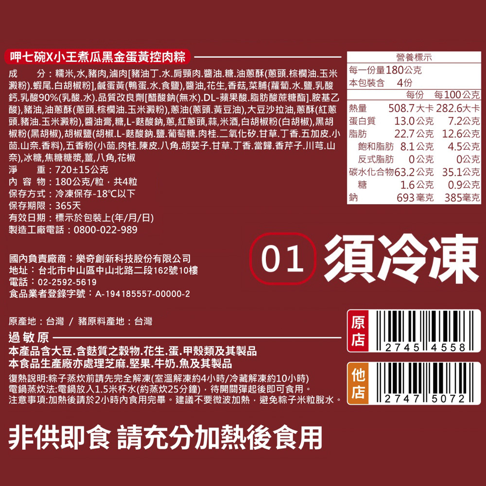 1.商品組合/規格:【呷七碗 x 小王煮瓜】黑金蛋黃控肉粽(4入/袋) x2袋2.商品品名:【呷七碗 x 小王煮瓜】黑金蛋黃控肉粽(4入/袋)3.內容成分:糯米,水,豬肉,滷肉(豬皮油丁.豬肩頸肉.水.醬油.糖.紅蔥頭.蝦尾.白胡椒),豬油,大豆沙拉油,花生,香菇,菜脯(蘿蔔.水.鹽.乳酸鈣.乳酸90%(乳酸.水).品質改良劑[醋酸鈉(無水).DL-蘋果酸.脂肪酸蔗糖酯].胺基乙酸),醬油,鹹蛋黃(鴨蛋.食鹽),蔥酥(紅蔥頭.洋蔥.玉米粉.棕櫚油),紅蔥頭,蒜,薑,米酒,糖.L-麩酸鈉,白胡椒粉(白胡椒),黑胡椒粉(黑胡椒),胡椒鹽(胡椒.L-麩酸鈉.鹽.葡萄糖.肉桂.二氧化矽.甘草.丁香.五加皮.小茴.香料),五香粉(小茴.肉桂.陳皮.八角.胡荽子.甘草.丁香.當歸.香芹子.川芎),焦糖糖漿,八角,花椒。※本產品含大豆.含麩質之穀物.花生.蛋.甲殼類及其製品。本食品生產廠亦處理芝麻.堅果.牛奶.魚及其製品。4.商品重(容)量:720g(180g*4顆)/袋5.原產地(國):台灣※豬原料產地:台灣6.保存期限:-18℃以下冷凍 12個月(實際依商品包裝標示)7.製造廠商或國內負責廠商名稱:樂奇創新科技股份有限公司8.製造廠商或國內負責廠商地址:104027 台北市中山區中山北路二段162號10樓9.製造廠商或國內負責廠商電話:02-2592-561910.食品業者登錄字號:A-194185557-00000-211.投保產品責任險字號:明台產物保險 0803-14PDT00874號