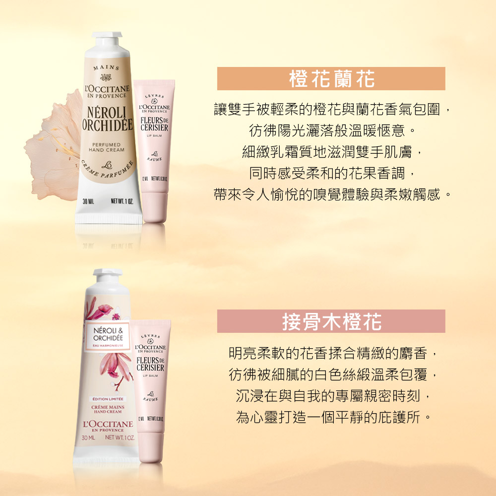 • 櫻花護唇膏12ml,數量:1 • 橙花&蘭花護手霜30ml,數量:1 • 禮盒,數量:1