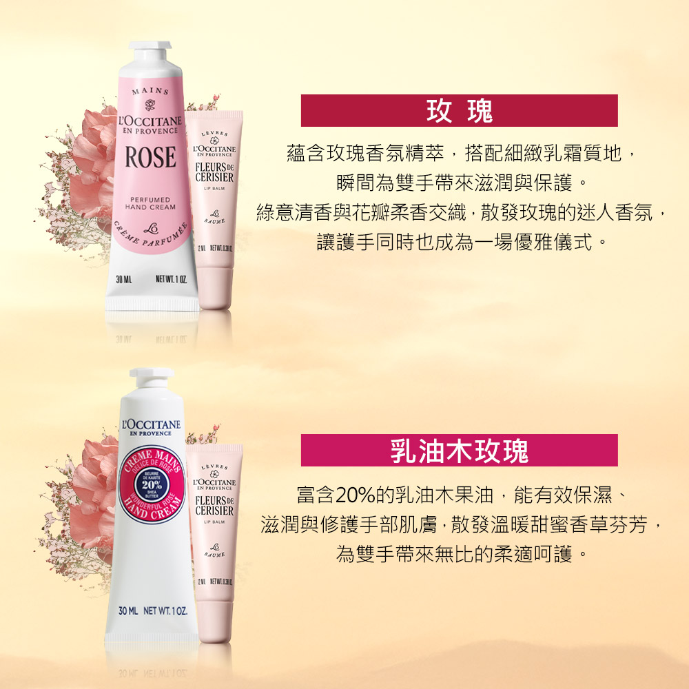• 櫻花護唇膏12ml,數量:1• 乳油木玫瑰護手霜30ml,數量:1• 禮盒,數量:1
