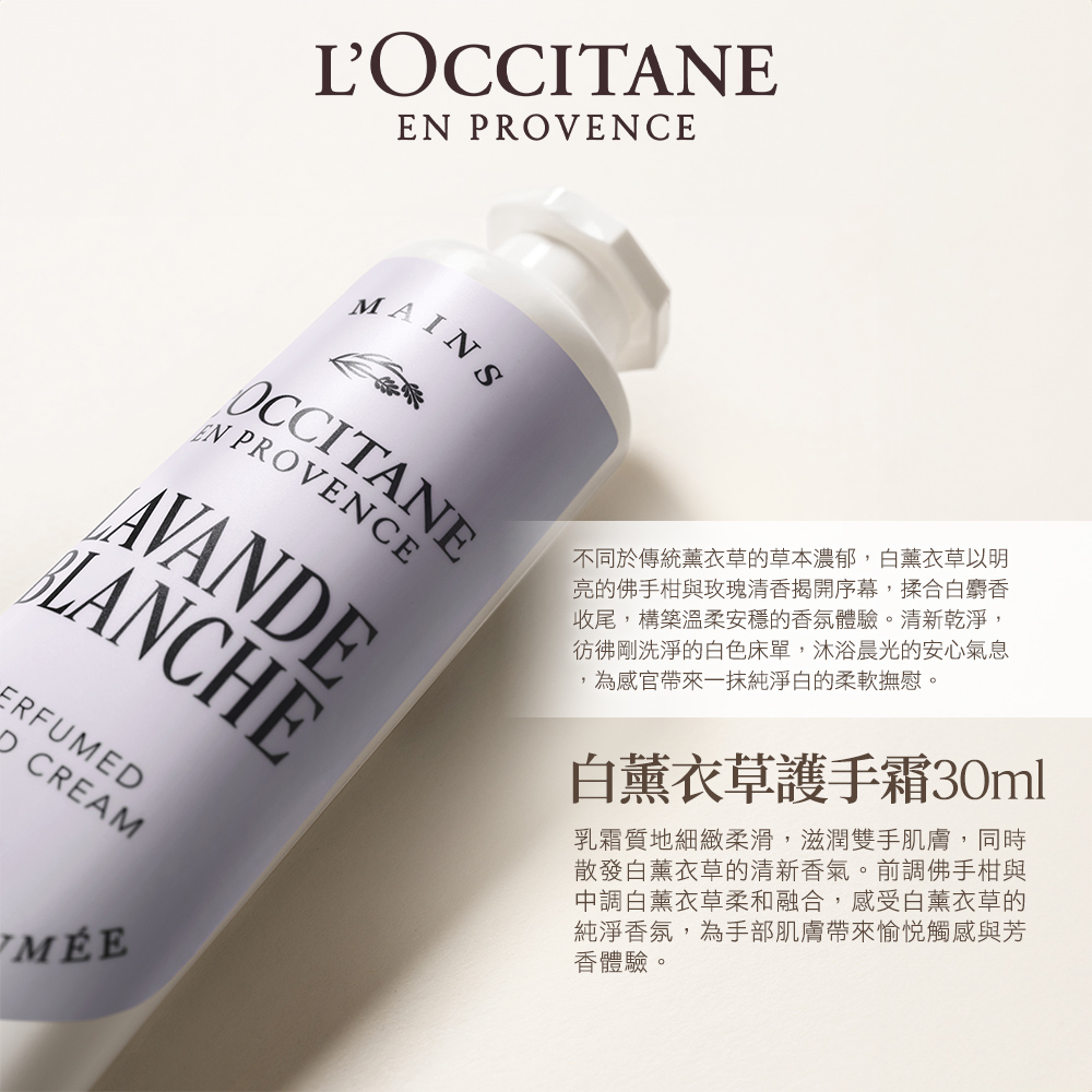 蘊含普羅旺斯真實薰衣草精華油及蜜拉/永恆白色薰衣草精華油,揉合乳油木果油,能有效保濕、柔潤肌膚,舒緩乾燥不適,滋潤修護並保護雙手,重拾細緻絲滑柔嫩膚觸,同時散發細緻迷人的白色薰衣草香氣!