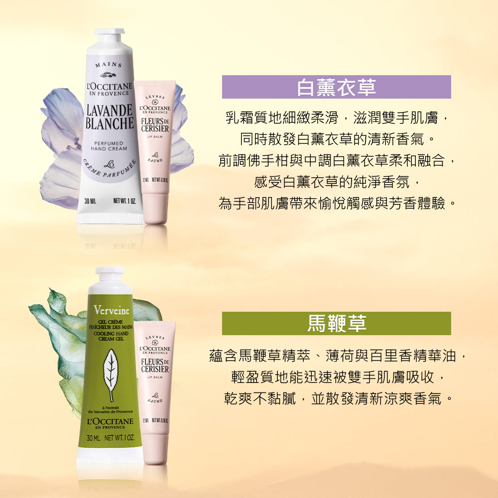 • 櫻花護唇膏12ml,數量:1• 白薰衣草護手霜30ml,數量:1 • 禮盒,數量:1
