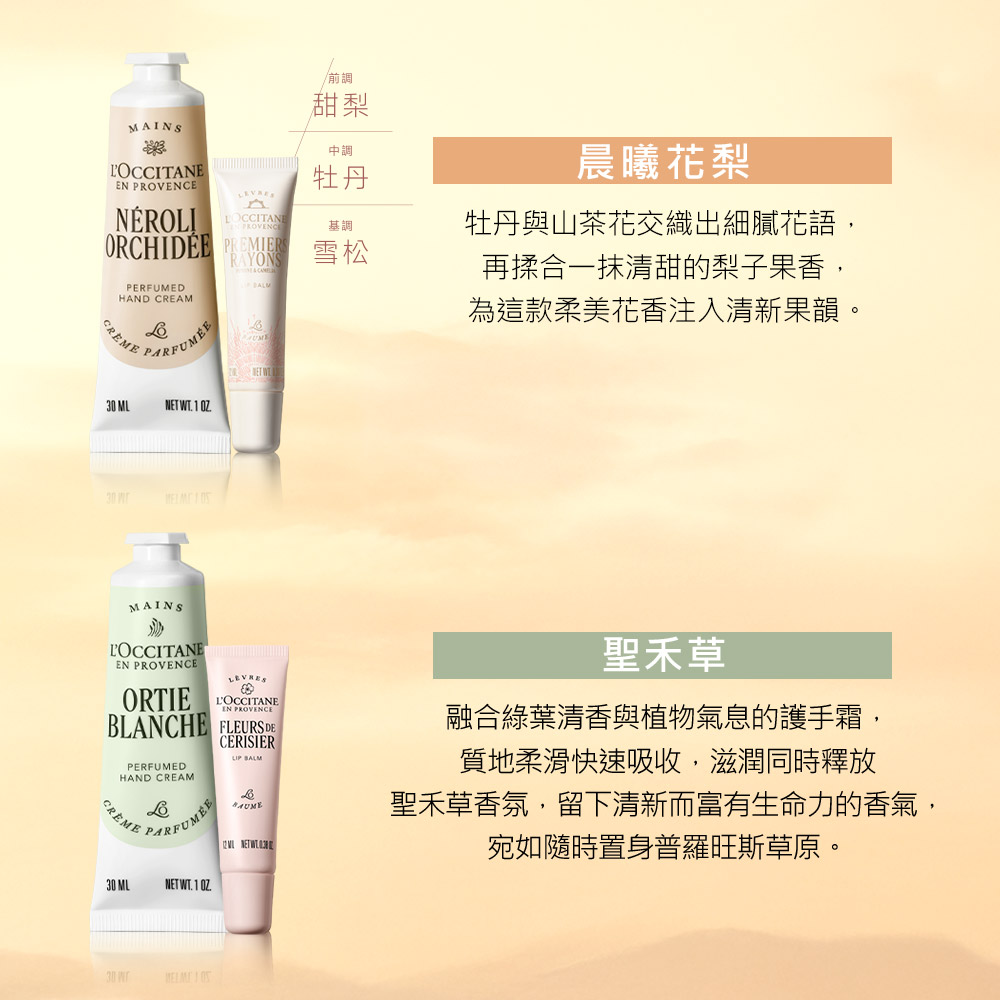 • 晨曦花梨護唇膏 12ml ,數量:1• 橙花蘭花護手霜 30ml,數量:1• 開心小物盒(空禮盒),數量:1
