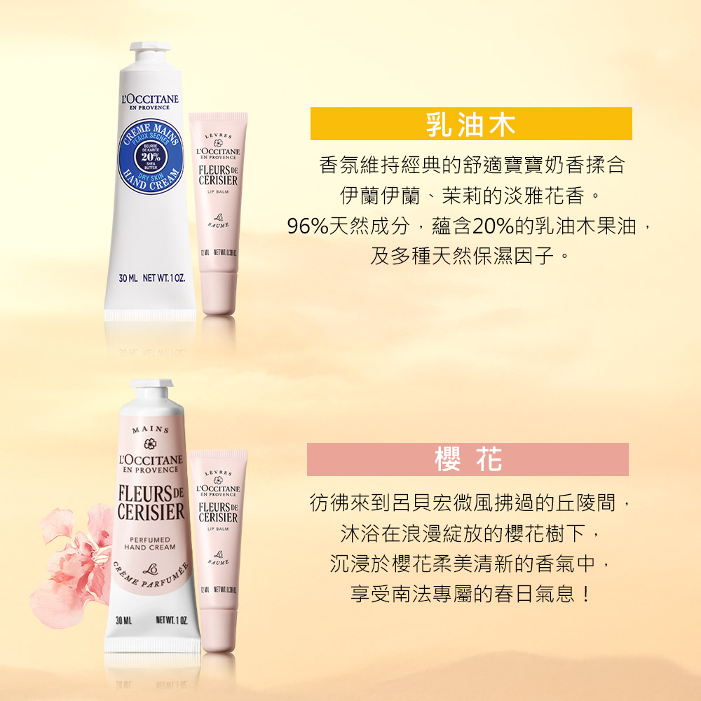 • 櫻花護唇膏12ml,數量:1• 乳油木護手霜30ml,數量:1• 禮盒,數量:1