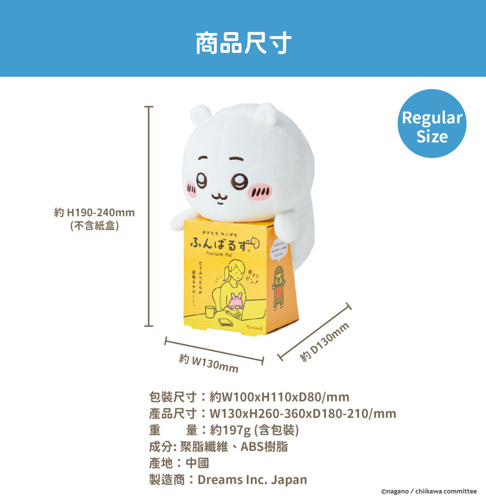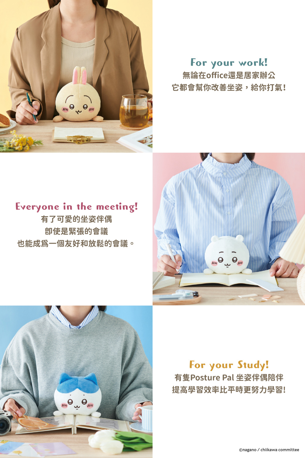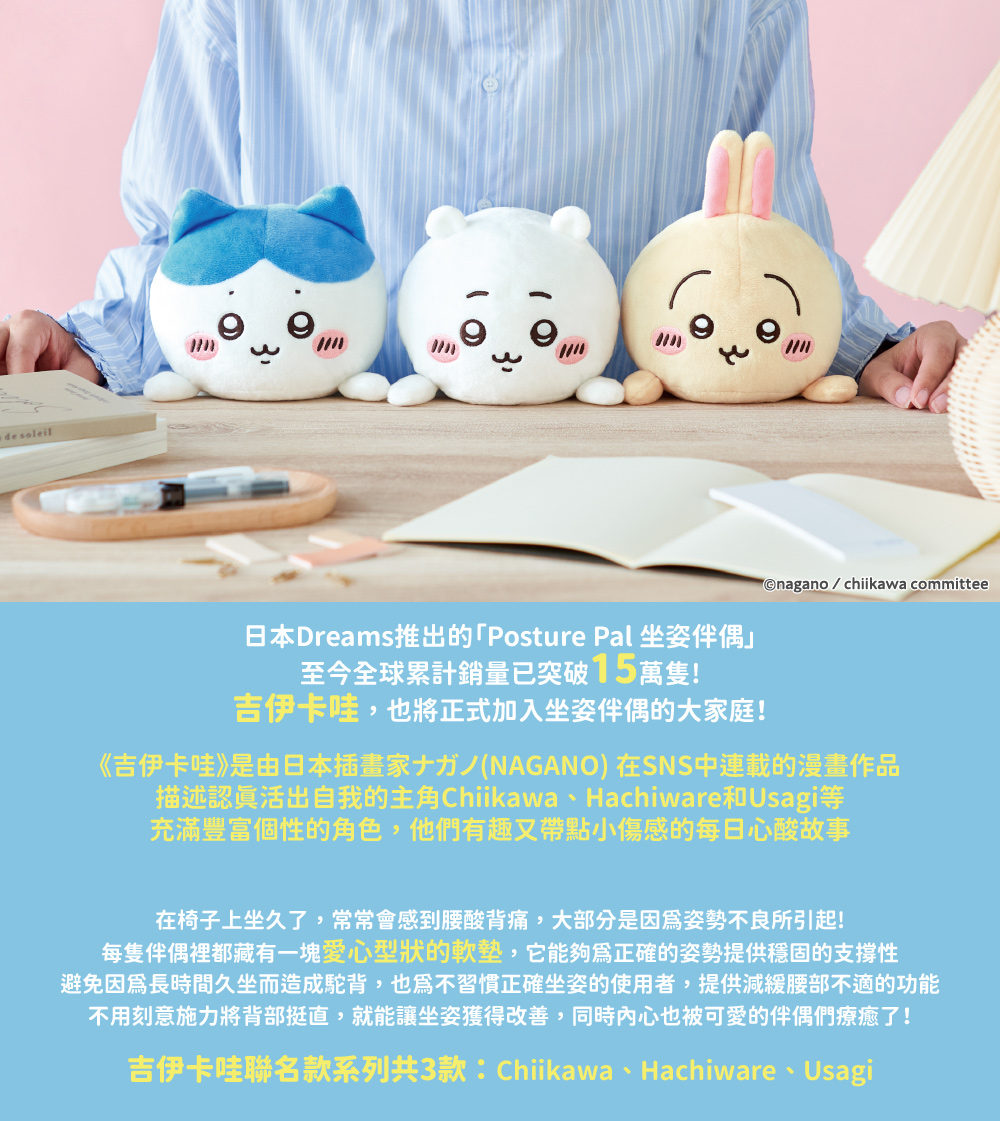 日本Dreams推出的「Posture Pal 坐姿伴偶」至今全球累計銷量已突破15萬隻!風靡全球的吉伊卡哇,也將正式加入坐姿伴偶的大家庭!《吉伊卡哇》是由日本插畫家ナガノ(NAGANO)在SNS中連載的漫畫作品描述認真活出自我的主角Chiikawa、Hachiware、Usagi等充滿豐富個性的角色他們有趣又帶點小傷感的每日心酸故事~