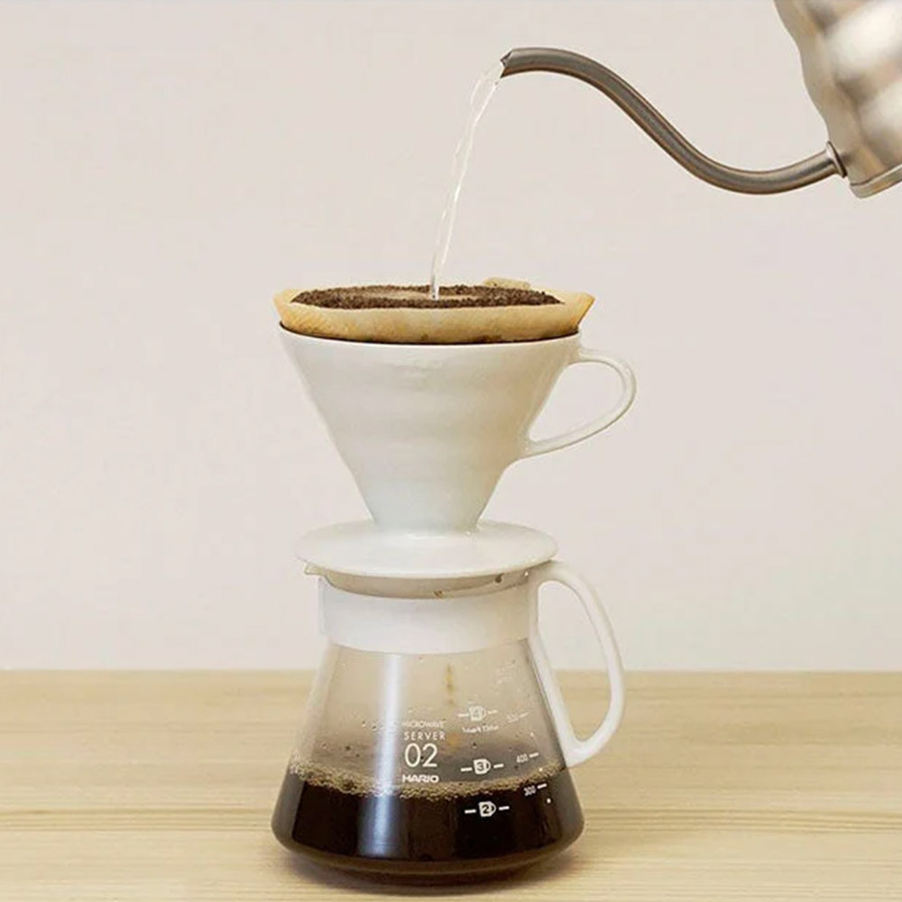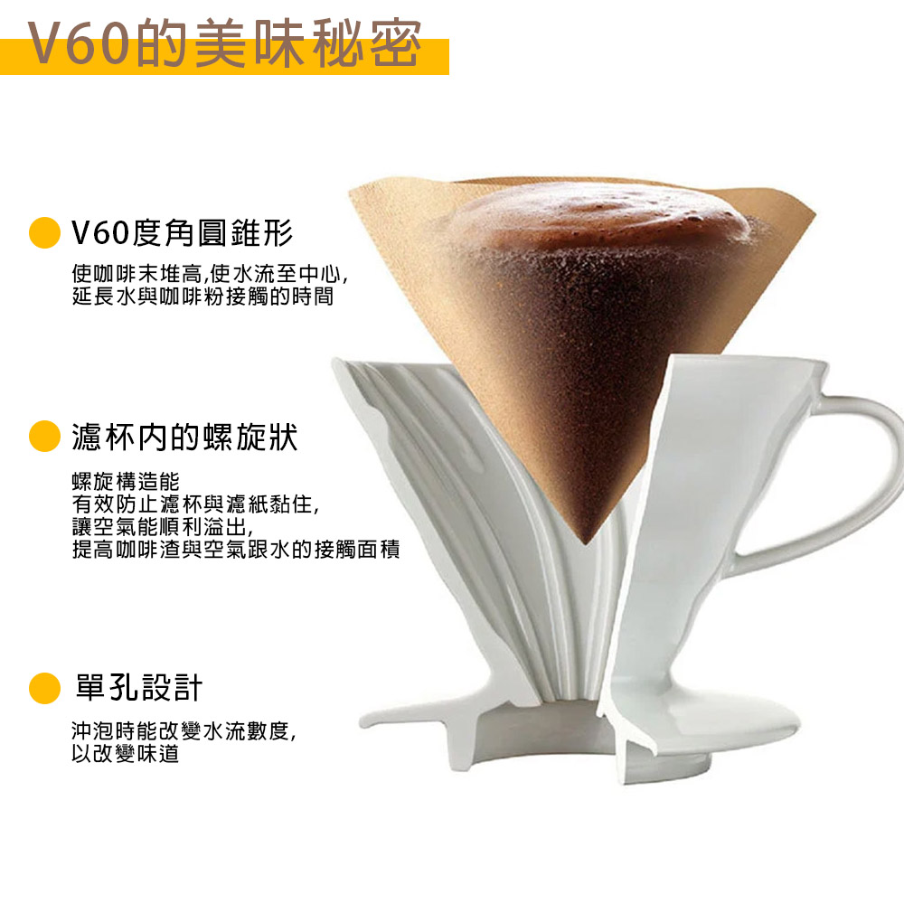【經典 V60 螺旋結構】: 內部的螺旋肋骨設計能引導空氣排出,讓咖啡粉充分膨脹,展現 V60 經典的乾淨度與層次感。02 尺寸(1-4人份)適合家庭聚會分享。