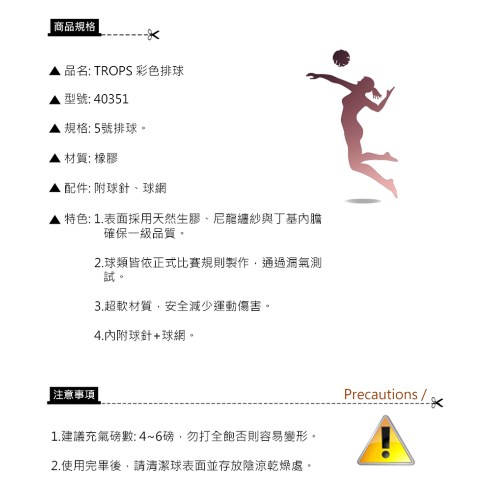 1.表面採用天然生膠、尼龍纏紗與丁基內膽確保一級品質。2.球類皆依正式比賽規則製作,通過漏氣測試。3,超軟材質,安全減少運動傷害。4.內附球針+球網。