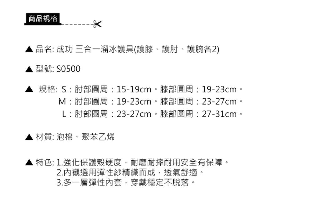 型號:S0500顏色:黑色、藍色、粉紅[規格]S:肘部圓周:15-19cm。膝部圓周:19-23cm。M:肘部圓周:19-23cm。膝部圓周:23-27cm。L:肘部圓周:23-27cm。膝部圓周:27-31cm。[材質] 泡棉、聚苯乙烯[內容] 護膝、護肘、護掌左右手各1