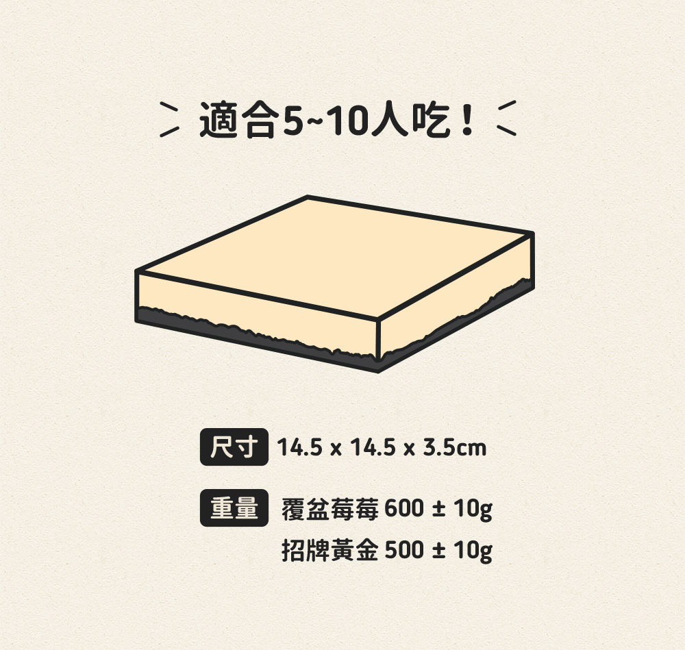 口味:黃金招牌、覆盆莓莓尺寸:500g ± 10g / 14.5 x 14.5 cm (個)保存方式: 冷凍保存14天;有效期限,請詳見產品包裝標示