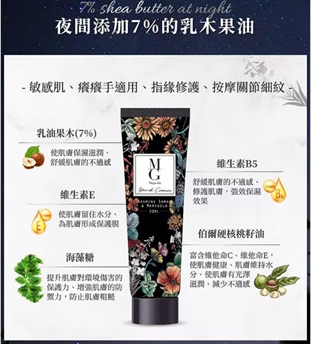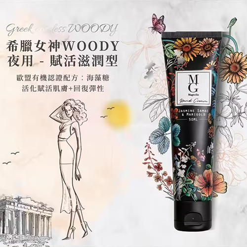 🌟夜用WOODY希臘女神護手霜🌟添加高濃度7%乳木果油成分,夜晚深層修護,隔天手部依舊保有保濕滋潤感!♥ 主成分:乳油木果(7%)、維生素B5、維生素E、柏爾硬核桃籽油、歐盟認證海藻糖♥ 商品特色:保濕滋潤、指緣(指節)修護♥ 香味:葡萄柚、萊姆、香根草(中性木質調)♥ 香氛是採用世界第一大廠美國IFF香氛♥ 通過SGS合格認證,不含四大重金屬、大腸桿菌等♥ 容量:50ml