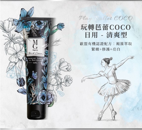 🌟日用COCO玩轉芭蕾護手霜🌟是一款可輕鬆使用鍵盤打字、滑手機,也不用怕沾黏的護手霜,享受手部保濕滋潤、指緣(指節)修護!♥ 主成分:乳油木果(0.5%)、維生素B5、維生素E、柏爾硬核桃籽油、歐盟認證褐藻萃取、熊果素♥ 商品特色:保濕滋潤、緊緻亮白、修護指緣!首創歐盟認證日夜修護型低敏香氛護手霜,針對手部敏感問題全方位改善與舒緩🎉♥ 香味:土耳其玫瑰、依蘭、甜橙(浪漫花香調)♥ 香氛採用世界第一大廠瑞士奇華頓♥ 通過SGS合格認證,不含四大重金屬、大腸桿菌等♥ 容量 : 50ml