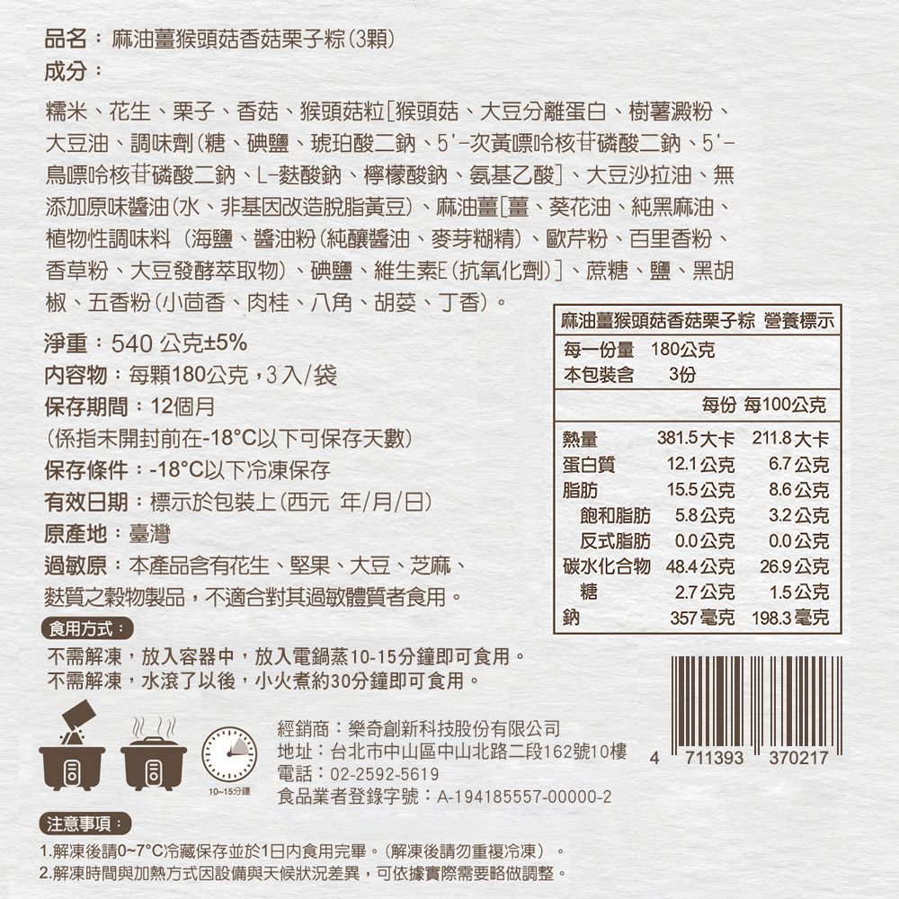 1.商品組合/規格:【陽明春天】麻油薑猴頭菇香菇栗子粽(3入/袋)(全素) x2袋2.商品品名:【陽明春天】麻油薑猴頭菇香菇栗子粽(3入/袋)(全素)3.內容成分:糯米、花生、栗子、香菇、猴頭菇粒[猴頭菇、大豆分離蛋白、樹薯澱粉、大豆油、調味劑(糖、碘鹽、琥珀酸二鈉、5'-次黃嘌呤核苷磷酸二鈉、5'-鳥嘌呤核苷磷酸二鈉、L-麩酸鈉、檸檬酸鈉、氨基乙酸]、大豆沙拉油、無添加原味醬油(水、非基因改造脫脂黃豆)、麻油薑[薑、葵花油、純黑麻油、植物性調味料 (海鹽、醬油粉(純釀醬油、麥芽糊精)、歐芹粉、百里香粉、香草粉、大豆發酵萃取物)、碘鹽、維生素E(抗氧化劑)]、蔗糖、鹽、黑胡椒、五香粉(小茴香、肉桂、八角、胡荽、丁香)。※本產品含有花生、堅果、大豆、芝麻、麩質之穀物製品,不適合對其過敏體質者食用。4.商品重(容)量:540g(180g*3顆)/袋5.原產地(國):台灣6.保存期限:-18℃以下冷凍 365天 (實際依商品包裝標示)7.製造廠商或國內負責廠商名稱:樂奇創新科技股份有限公司8.製造廠商或國內負責廠商地址:104027 台北市中山區中山北路二段162號10樓9.製造廠商或國內負責廠商電話:02-2592-561910.食品業者登錄字號:A-194185557-00000-211.投保產品責任險字號:明台產物保險 0803-14PDT00874號