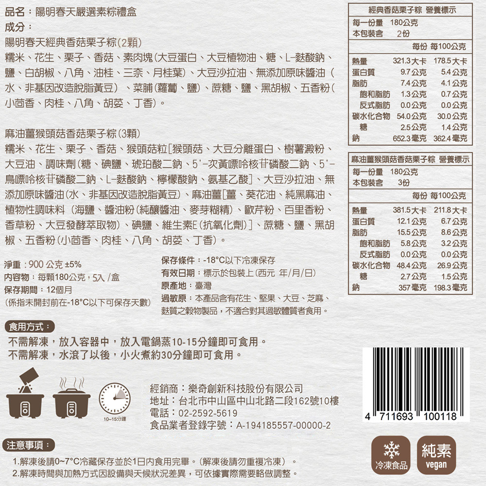 1.商品組合/規格:【陽明春天】嚴選素粽禮盒(5入/盒)(全素)2.商品品名:【陽明春天】嚴選素粽禮盒(5入/盒)(全素)3.內容成分:◆經典香菇栗子粽:糯米、花生、栗子、香菇、素肉塊(大豆蛋白、大豆植物油、糖、L-麩酸鈉、鹽、白胡椒、八角、油桂、三奈、月桂葉)、大豆沙拉油、無添加原味醬油(水、非基因改造脫脂黃豆)、麻油薑、蔗糖、鹽、黑胡椒、五香粉(小茴香、肉桂、八角、胡荽、丁香)。◆麻油薑猴頭菇香菇栗子粽:糯米、花生、栗子、香菇、猴頭菇粒[猴頭菇、大豆分離蛋白、樹薯澱粉、大豆油、調味劑(糖、碘鹽、琥珀酸二鈉、5'-次黃嘌呤核苷磷酸二鈉、5'-鳥嘌呤核苷磷酸二鈉、L-麩酸鈉、檸檬酸鈉、氨基乙酸]、大豆沙拉油、無添加原味醬油(水、非基因改造脫脂黃豆)、麻油薑[薑、葵花油、純黑麻油、植物性調味料 (海鹽、醬油粉(純釀醬油、麥芽糊精)、歐芹粉、百里香粉、香草粉、大豆發酵萃取物)、碘鹽、維生素E(抗氧化劑)]、蔗糖、鹽、黑胡椒、五香粉(小茴香、肉桂、八角、胡荽、丁香)。※本產品含有花生、堅果、大豆、芝麻、麩質之穀物製品,不適合對其過敏體質者食用。4.商品重(容)量:900g(經典香菇栗子粽180g*2顆+麻油薑猴頭菇香菇栗子粽180g*3顆)/盒5.原產地(國):台灣6.保存期限:-18℃以下冷凍 365天 (實際依商品包裝標示)7.製造廠商或國內負責廠商名稱:樂奇創新科技股份有限公司8.製造廠商或國內負責廠商地址:104027 台北市中山區中山北路二段162號10樓9.製造廠商或國內負責廠商電話:02-2592-561910.食品業者登錄字號:A-194185557-00000-211.投保產品責任險字號:明台產物保險 0803-14PDT00874號