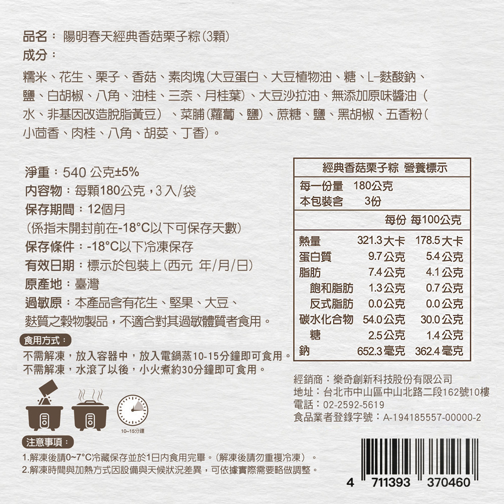 1.商品組合/規格:【陽明春天】經典香菇栗子粽(3入/袋)(全素)x2袋2.商品品名:【陽明春天】經典香菇栗子粽(3入/袋)(全素)3.內容成分:糯米、花生、栗子、香菇、素肉塊(大豆蛋白、大豆植物油、糖、L-麩酸鈉、鹽、白胡椒、八角、油桂、三奈、月桂葉)、大豆沙拉油、無添加原味醬油(水、非基因改造脫脂黃豆)、菜脯、蔗糖、鹽、黑胡椒、五香粉(小茴香、肉桂、八角、胡荽、丁香)。※本產品含有花生、堅果、大豆、麩質之穀物製品,不適合對其過敏體質者食用。4.商品重(容)量:540g(180g*3顆)/袋5.原產地(國):台灣6.保存期限:-18℃以下冷凍 365天 (實際依商品包裝標示)7.製造廠商或國內負責廠商名稱:樂奇創新科技股份有限公司8.製造廠商或國內負責廠商地址:104027 台北市中山區中山北路二段162號10樓9.製造廠商或國內負責廠商電話:02-2592-561910.食品業者登錄字號:A-194185557-00000-211.投保產品責任險字號:明台產物保險 0803-14PDT00874號
