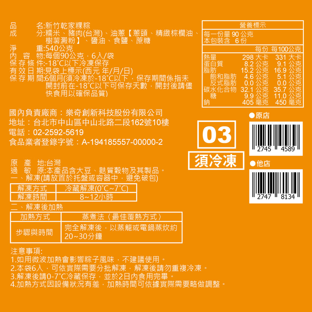 1.商品組合/規格:【乾家肉粽大王】新竹乾家粿粽(6入/袋) x2袋2.商品品名:【乾家肉粽大王】新竹乾家粿粽(6入/袋)3.內容成分:糯米、豬肉(台灣)、油蔥(蔥頭、精緻棕櫚油、樹薯澱粉)、醬油、食鹽、蔗糖。※本產品含大豆、麩質穀物及其製品。4.商品重(容)量:540g(粿粽90g*6顆)/袋5.原產地(國):台灣※豬肉(台灣)6.保存期限:-18℃以下冷凍 6個月(實際依商品包裝標示)7.製造廠商或國內負責廠商名稱:樂奇創新科技股份有限公司8.製造廠商或國內負責廠商地址:104027 台北市中山區中山北路二段162號10樓9.製造廠商或國內負責廠商電話:02-2592-561910.食品業者登錄字號:A-194185557-00000-211.投保產品責任險字號:明台產物保險 0803-14PDT00874號